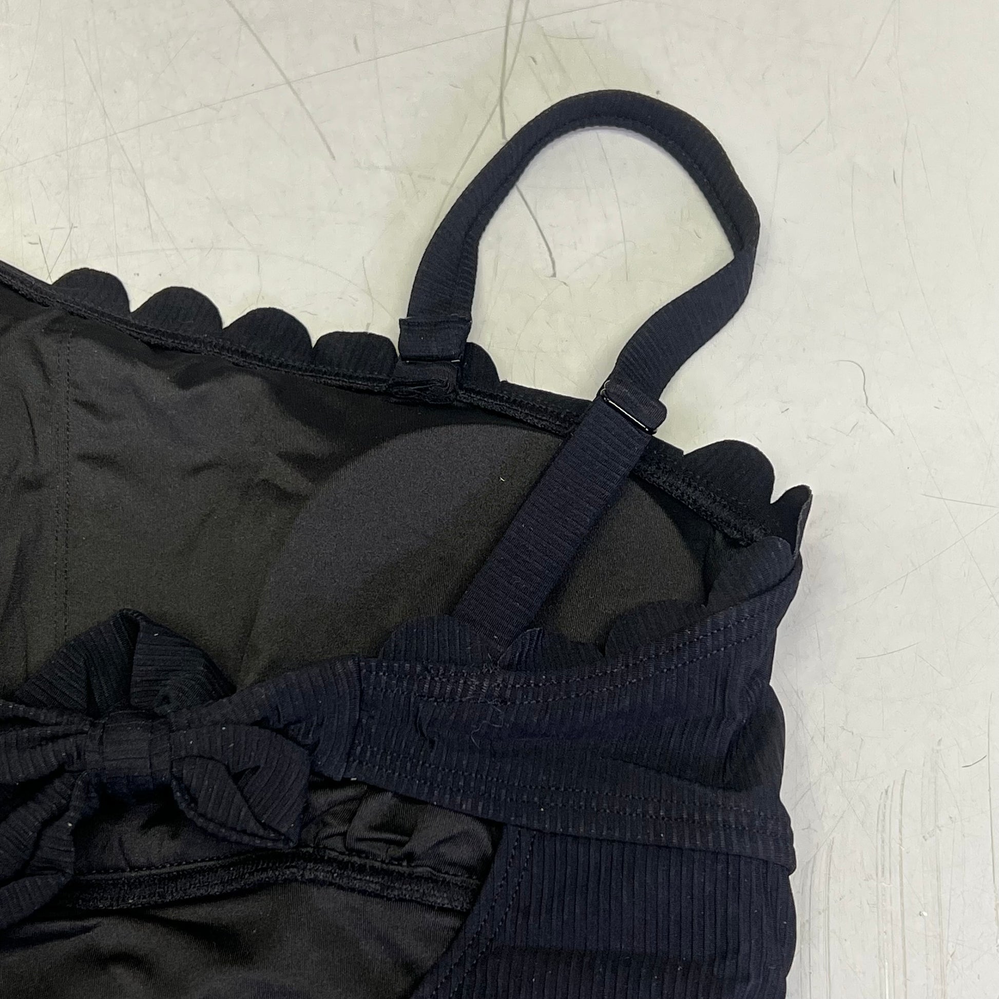 Square neck front and cut out back, wide straps and scalloped rim