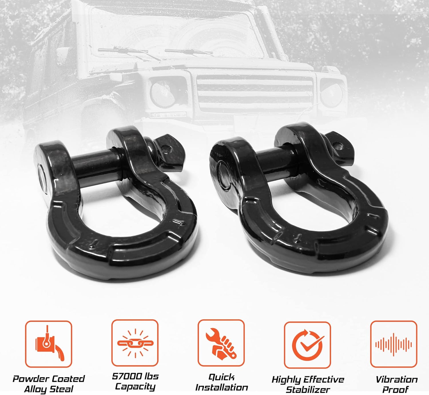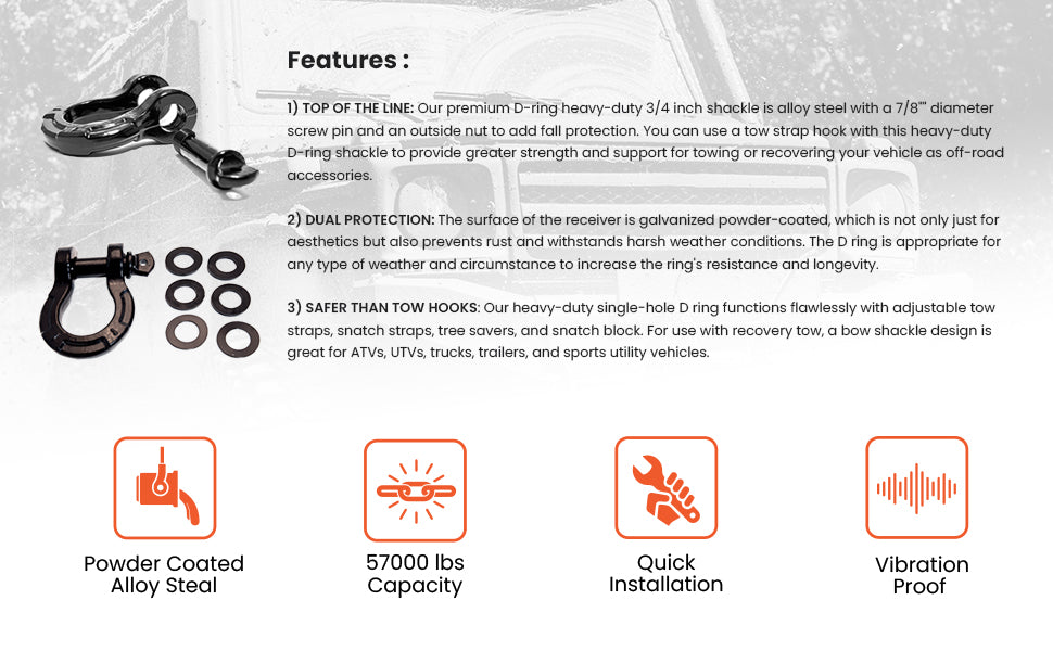 - TOP OF THE LINE: This tough 3/4" steel D-ring shackle with a 7/8" screw pin is built to handle heavy loads—up to 57,000 lbs! Perfect for off-road adventures, it works great with tow straps to give you extra muscle when pulling or recovering your vehicle. Strong, reliable, and ready to get the job done!