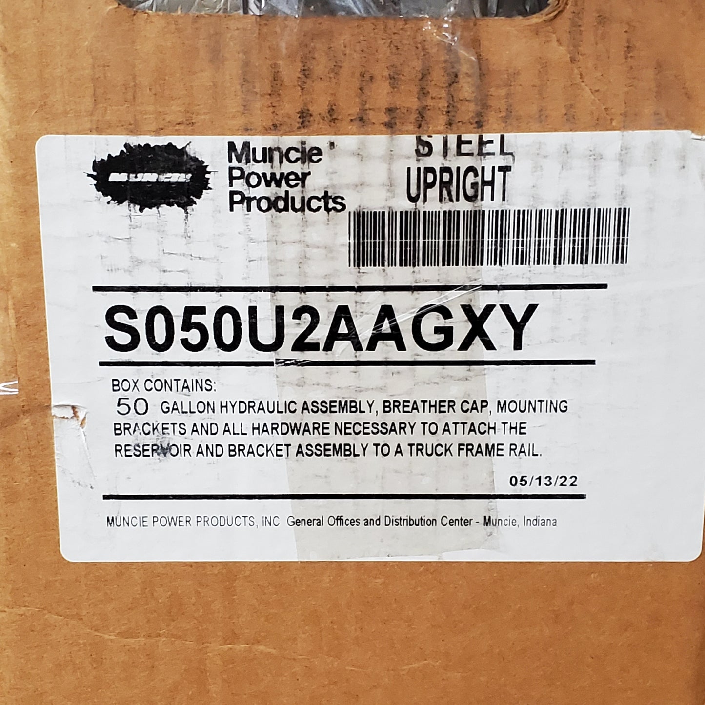 The Muncie Power Products S050U2AAGXY is a robust 50-gallon steel hydraulic reservoir tank designed for use with various hydraulic systems. The upright design offers space-saving benefits, and the durable steel construction ensures long-lasting performance. This black tank features a pre-installed Thermo King pick up tube for seamless integration with compatible Thermo King systems.
