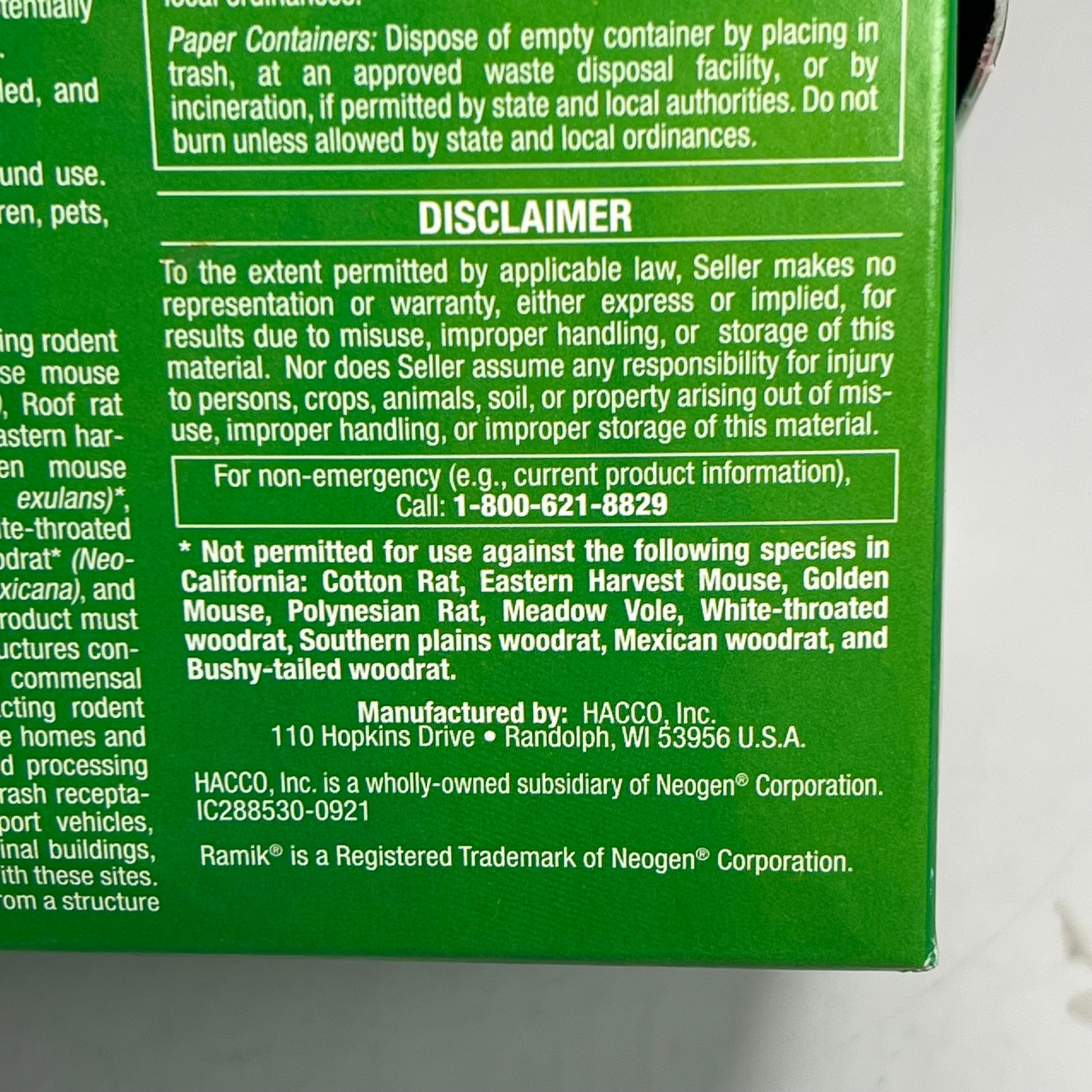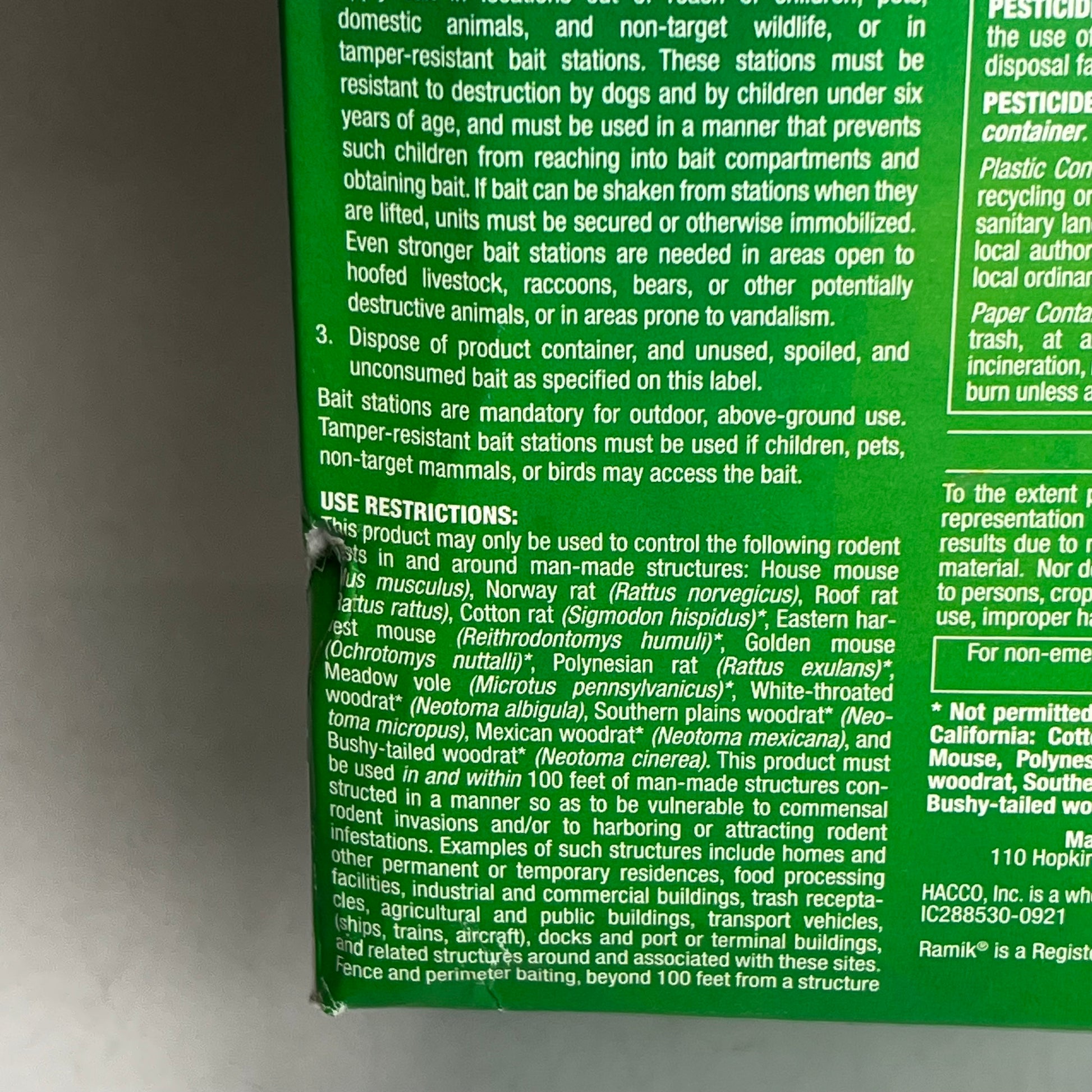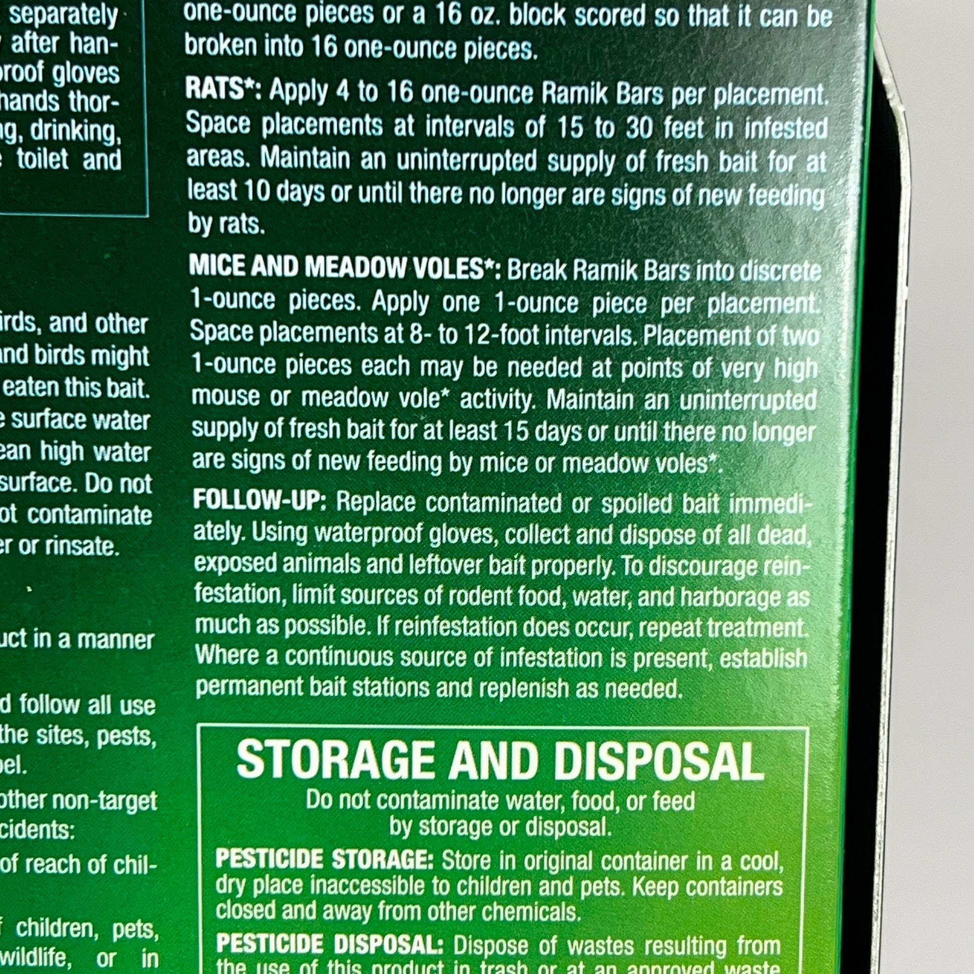Description: Ramik all-weather bar baits are manufactured utilizing a special proprietary extrusion process, where all the bait ingredients are fully blended, bonded and then shaped into weatherproof bait bars. A small amount of edible wax is added to allow uniform sized bars to be formed. Each 16 oz bar can be used whole or easily broken into 4 oz pieces or 16 1 oz pieces.