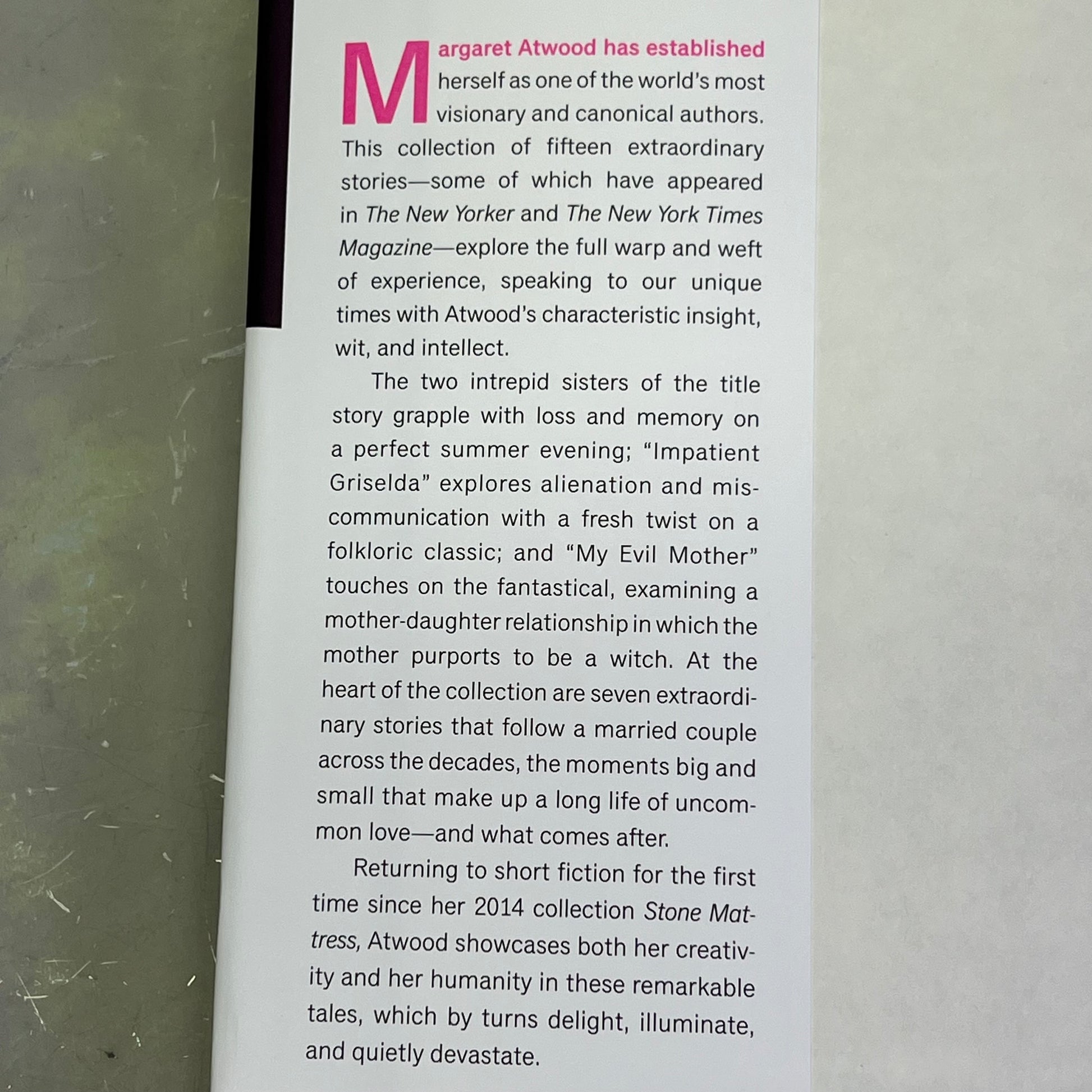Description: Margaret Atwood has established herself as one of the most visionary and canonical authors in the world. This collection of fifteen extraordinary stories—some of which have appeared in The New Yorker and The New York Times Magazine—explore the full warp and weft of experience, speaking to our unique times with Atwood’s characteristic insight, wit and intellect.