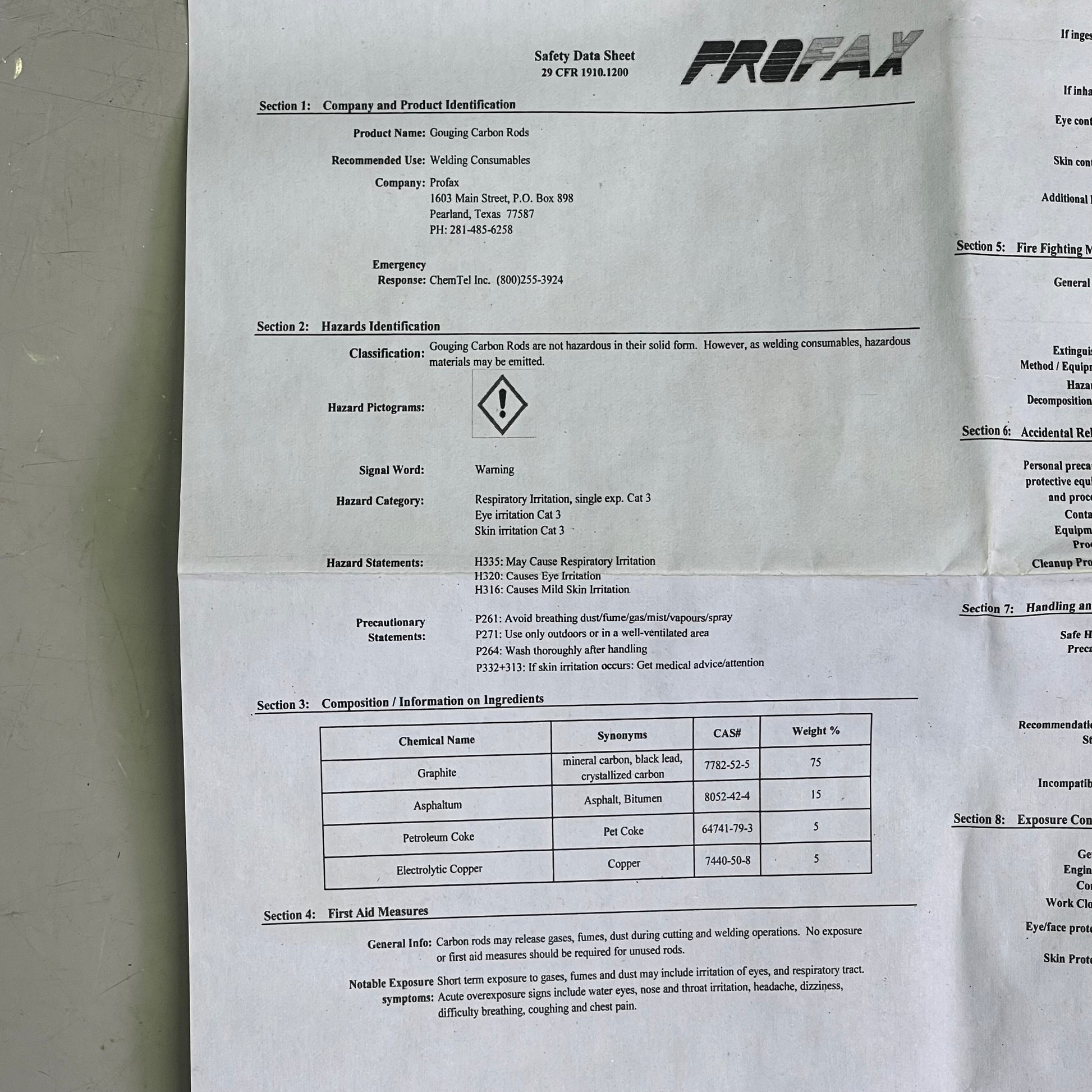 PROFAX (50 PK) Arc Gouging Carbons, 350~450 Amps DC 3/8"x5/32"x12" 00364OG103007