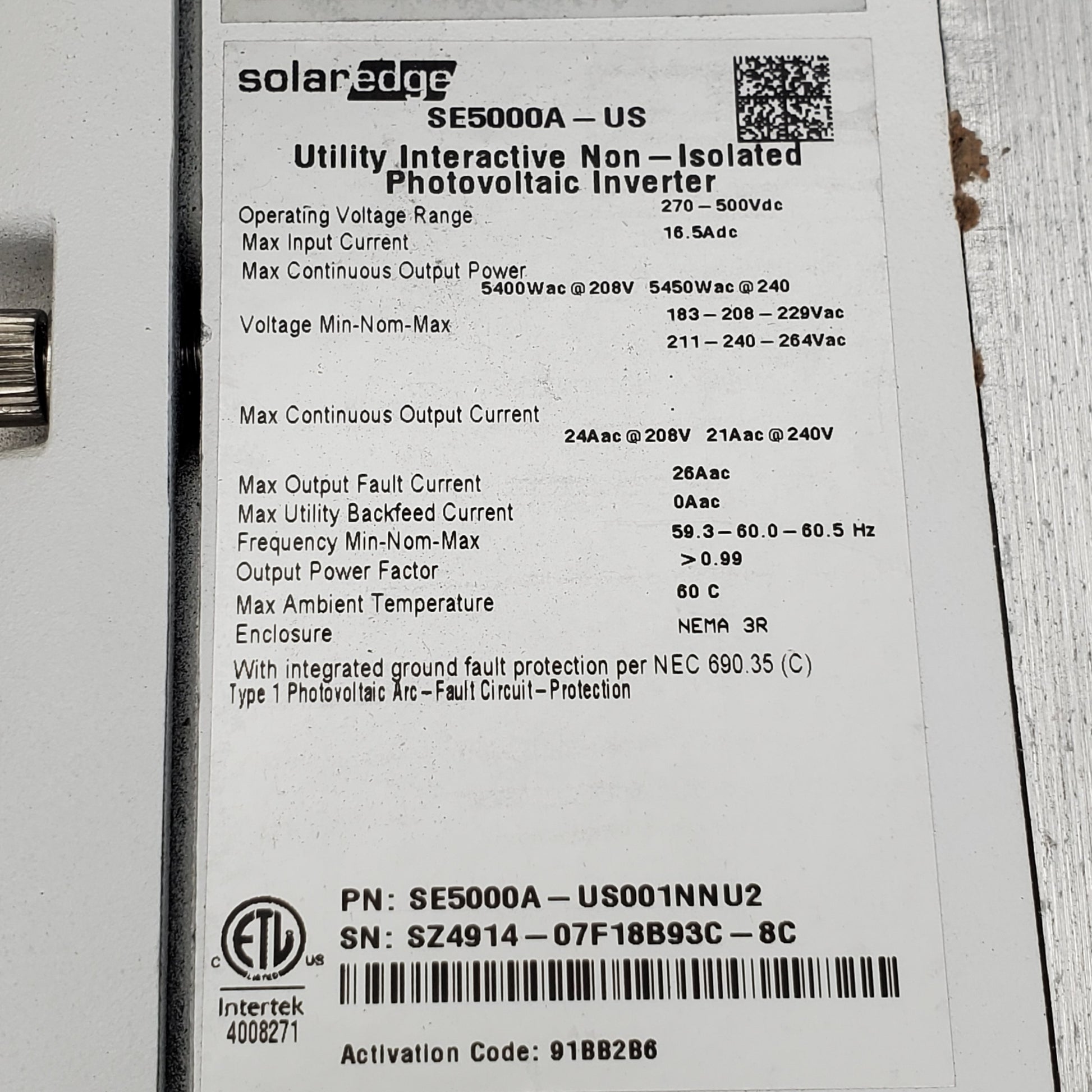 SOLAREDGE Photovoltaic System Dc Disconnect 270-500vdc SE5000A-US001NNU2 (For Parts)