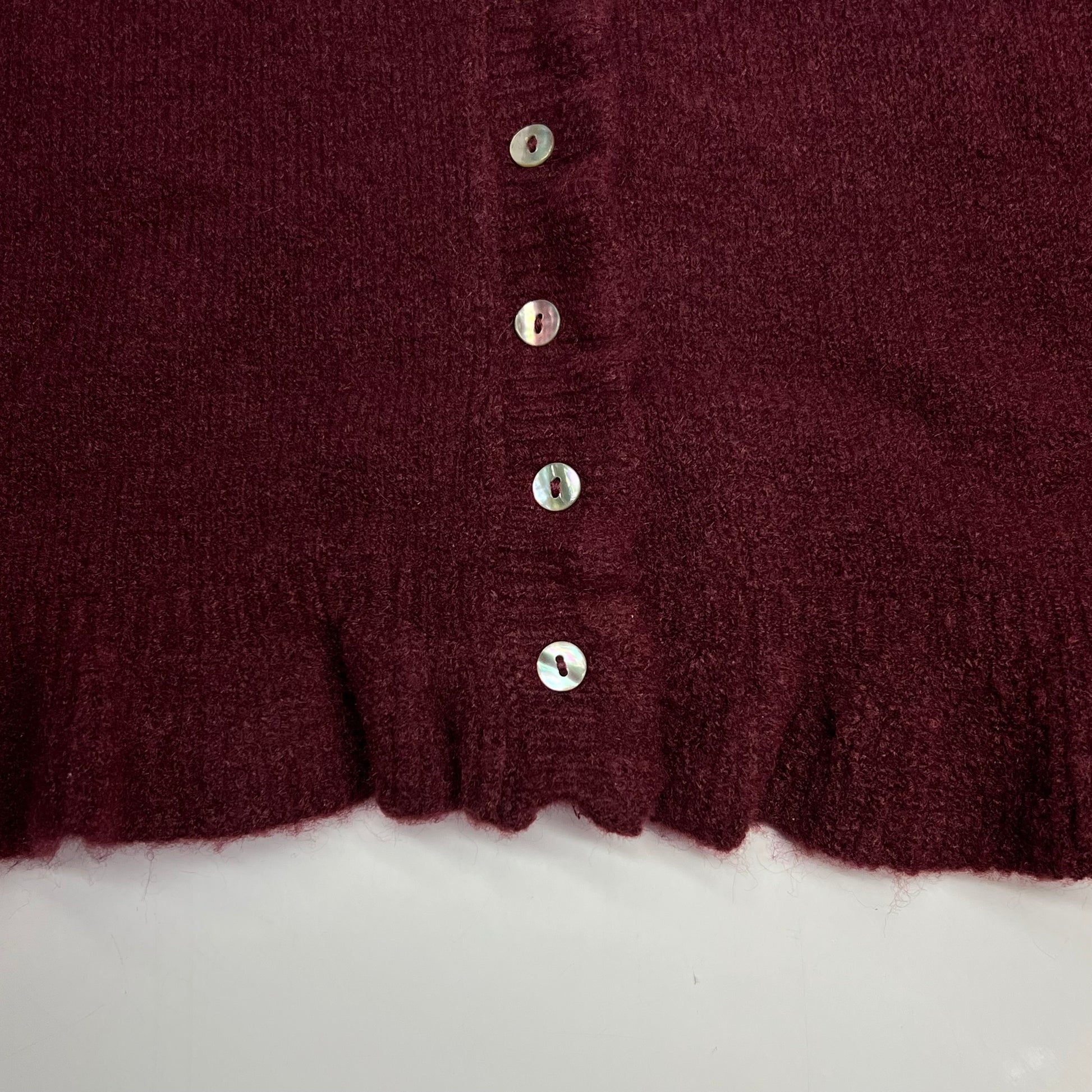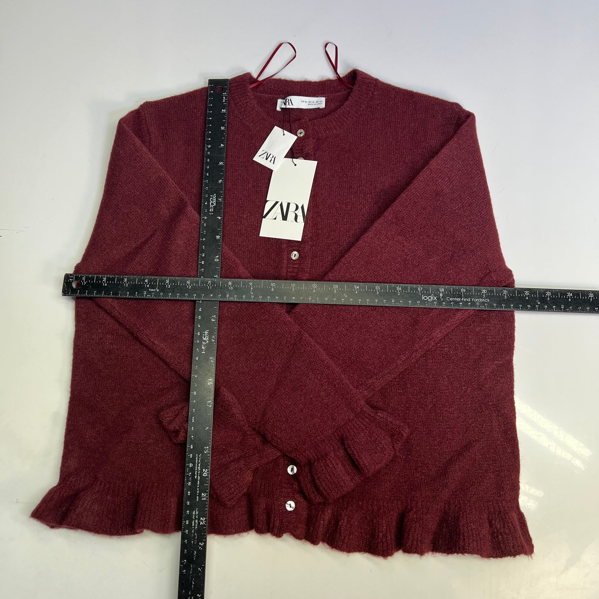 ZARA Plain Knit Cardigan W/ Ruffle Sleeves & Pearl Buttons Womens Sz XL Burgundy