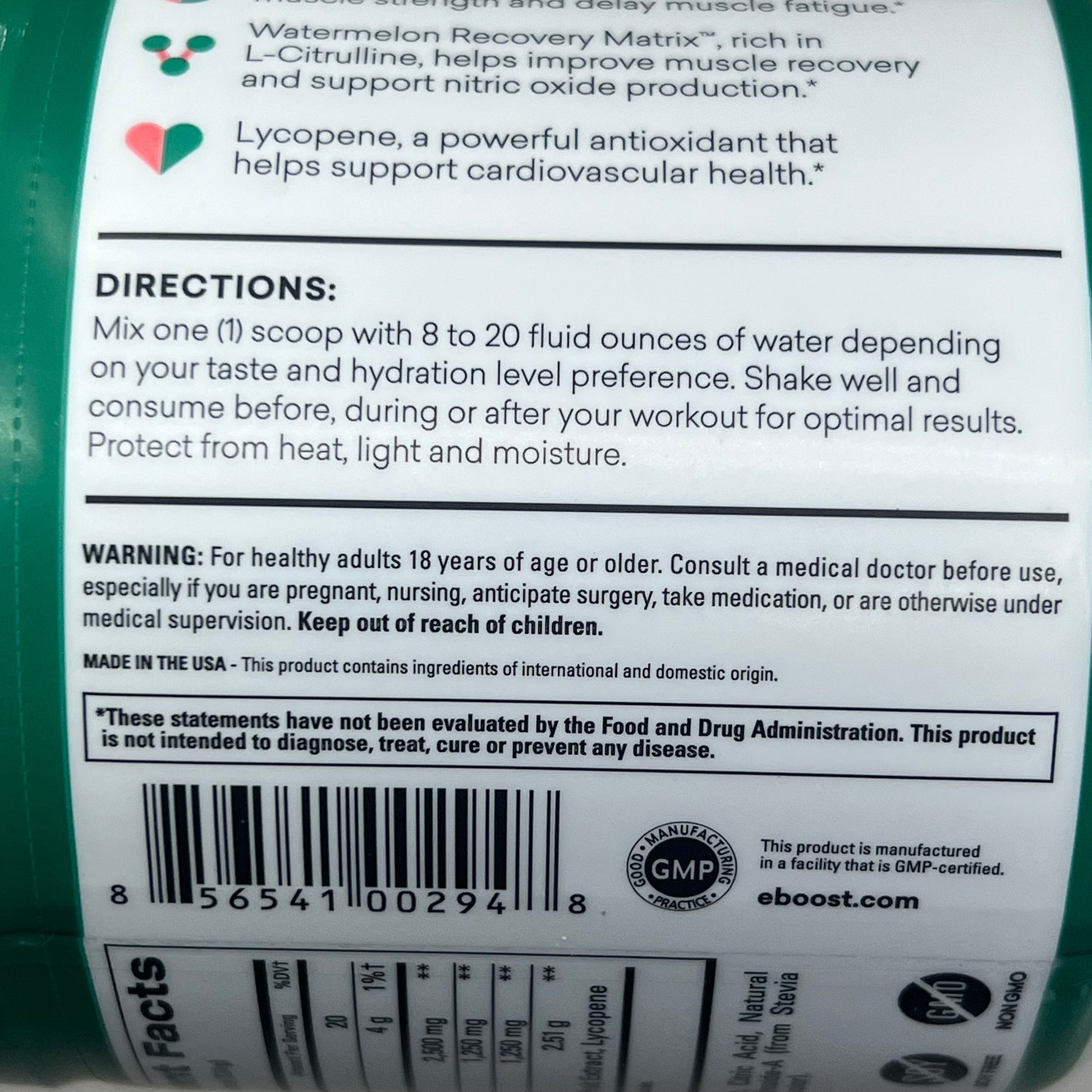 EBOOST Gluten-Free Plant-Based Pre-Workout Watermelon Rescue 20 Serving BB 08/25 D