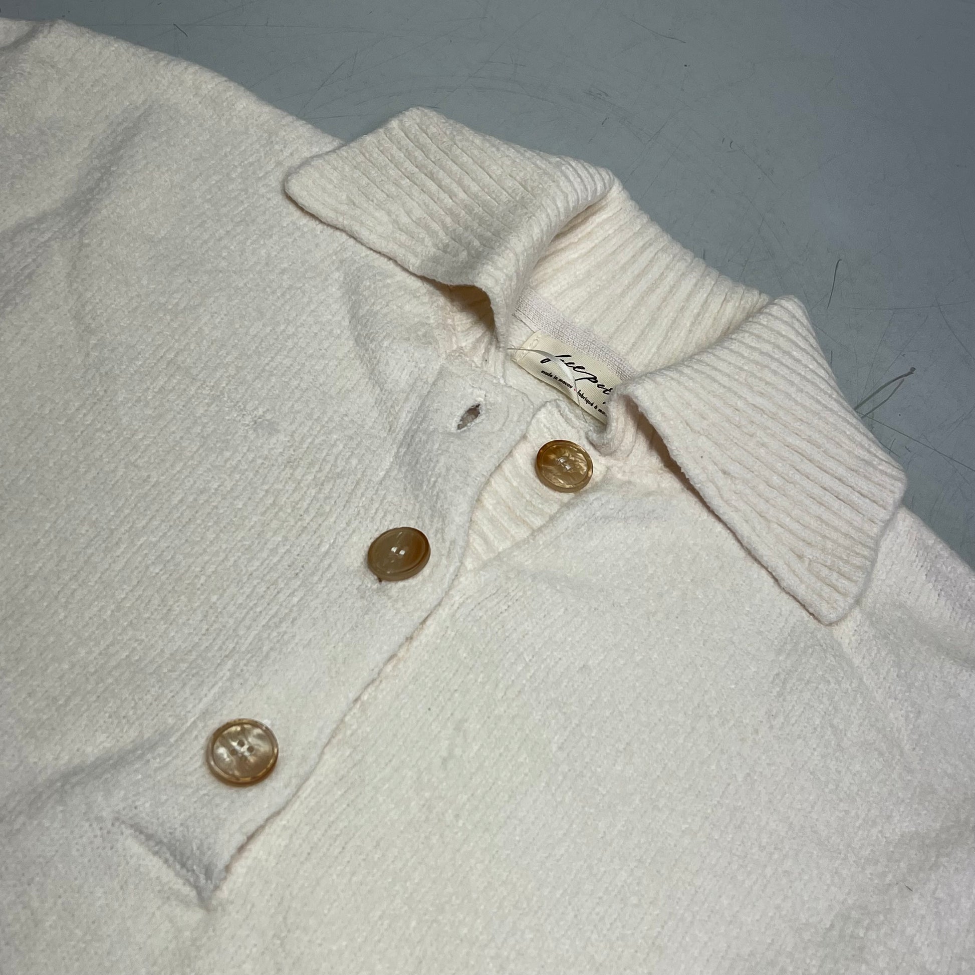 The definition of cozy, this sweater features a classic polo-inspired silhouette, a cotton-blend knit fabrication, and charming tortoise shell buttons.