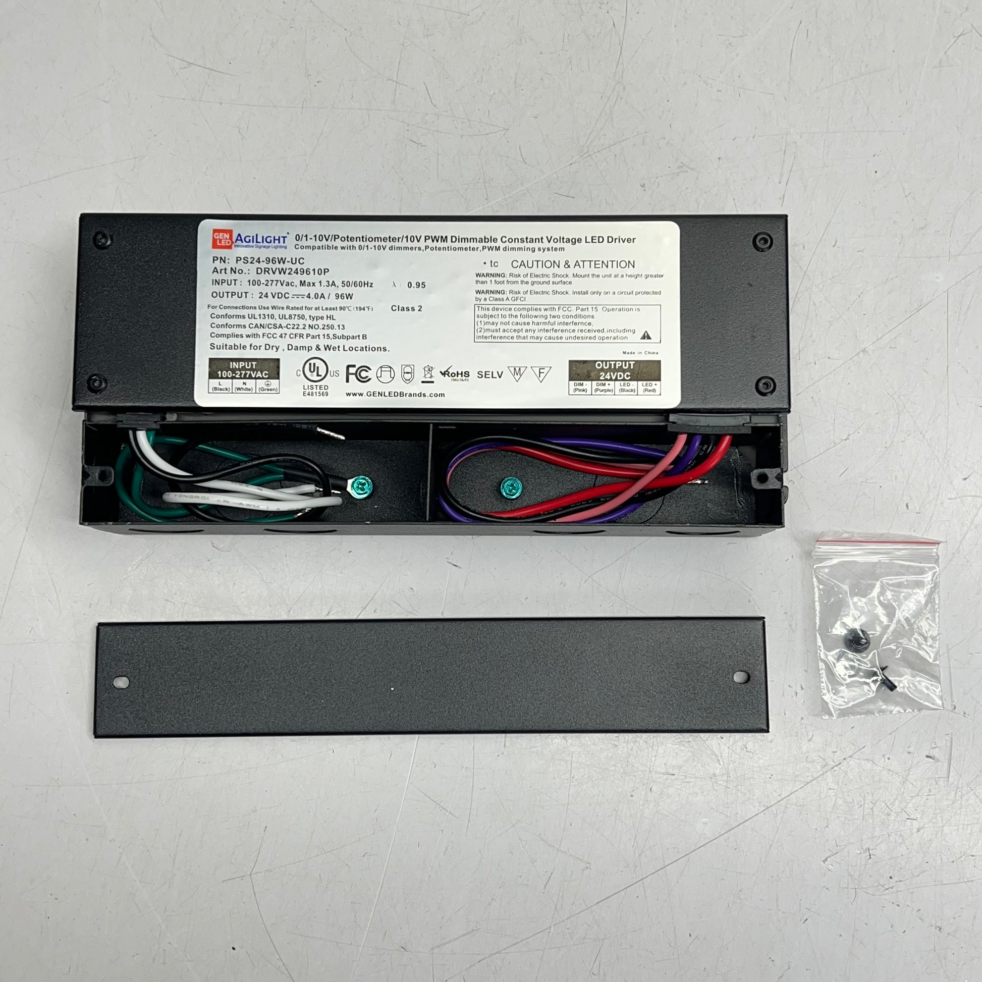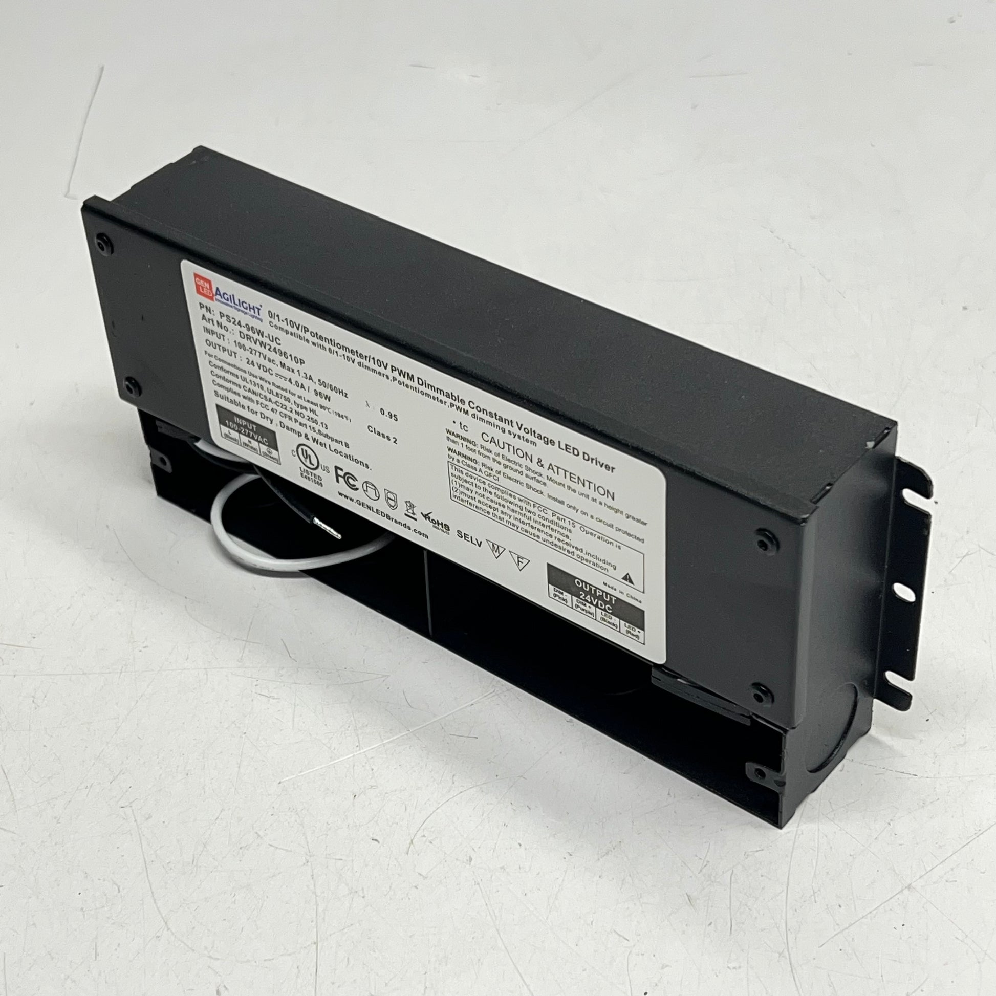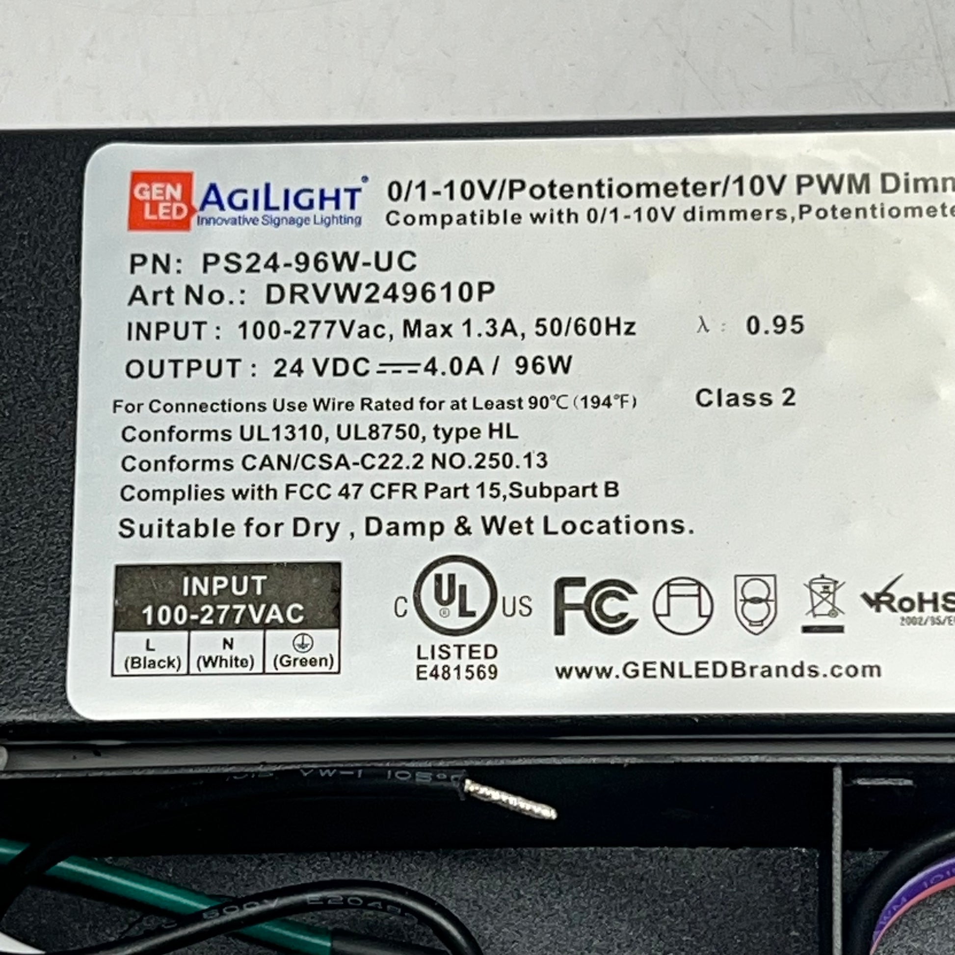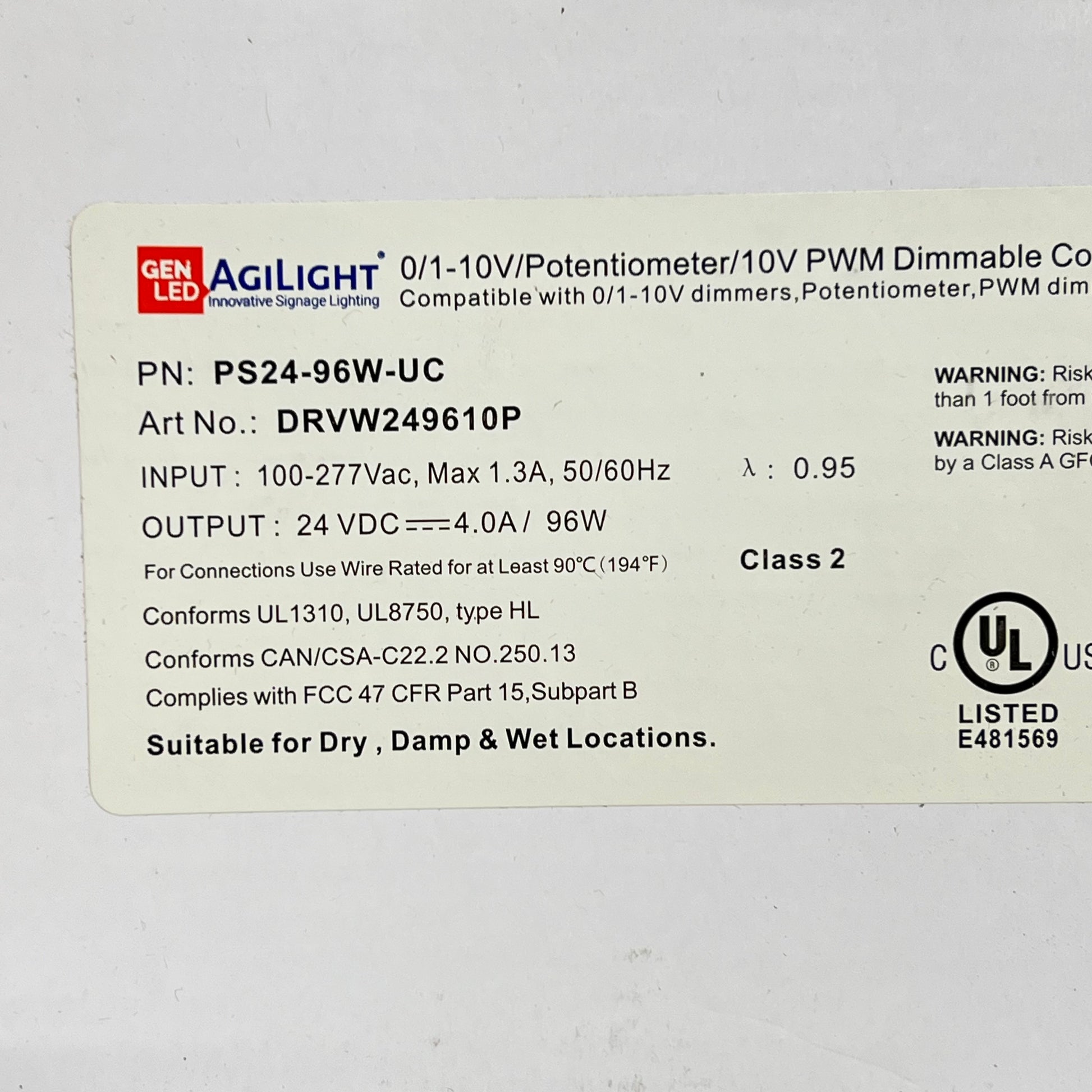 Description: This constant voltage Class 2 96W driver is UL Listed. It is UL rated for wet, damp, and dry locations and has an enclosure with isolated wire connections and a NEMA 4x rating. With input voltage ranging from 100-277 VAC, this driver is suited for commercial, industrial and residential applications. The 0-10V dimming uses PWM output and has a dimming range from 0.1-100% brightness.