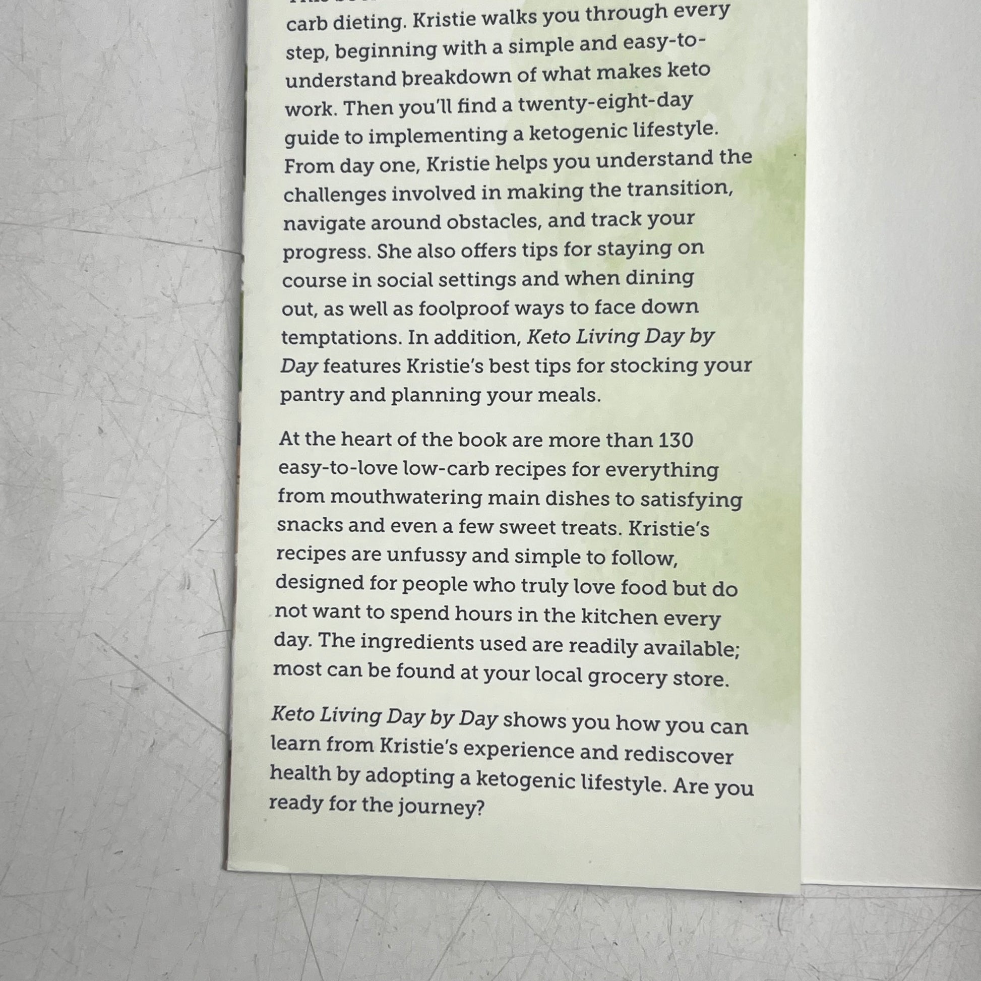 Section two of the book features a daily guide to help you make the keto way your way. Starting on day 1, Kristie shows you how to understand the challenges involved in making the transition, navigate around obstacles, and track your progress. She also offers