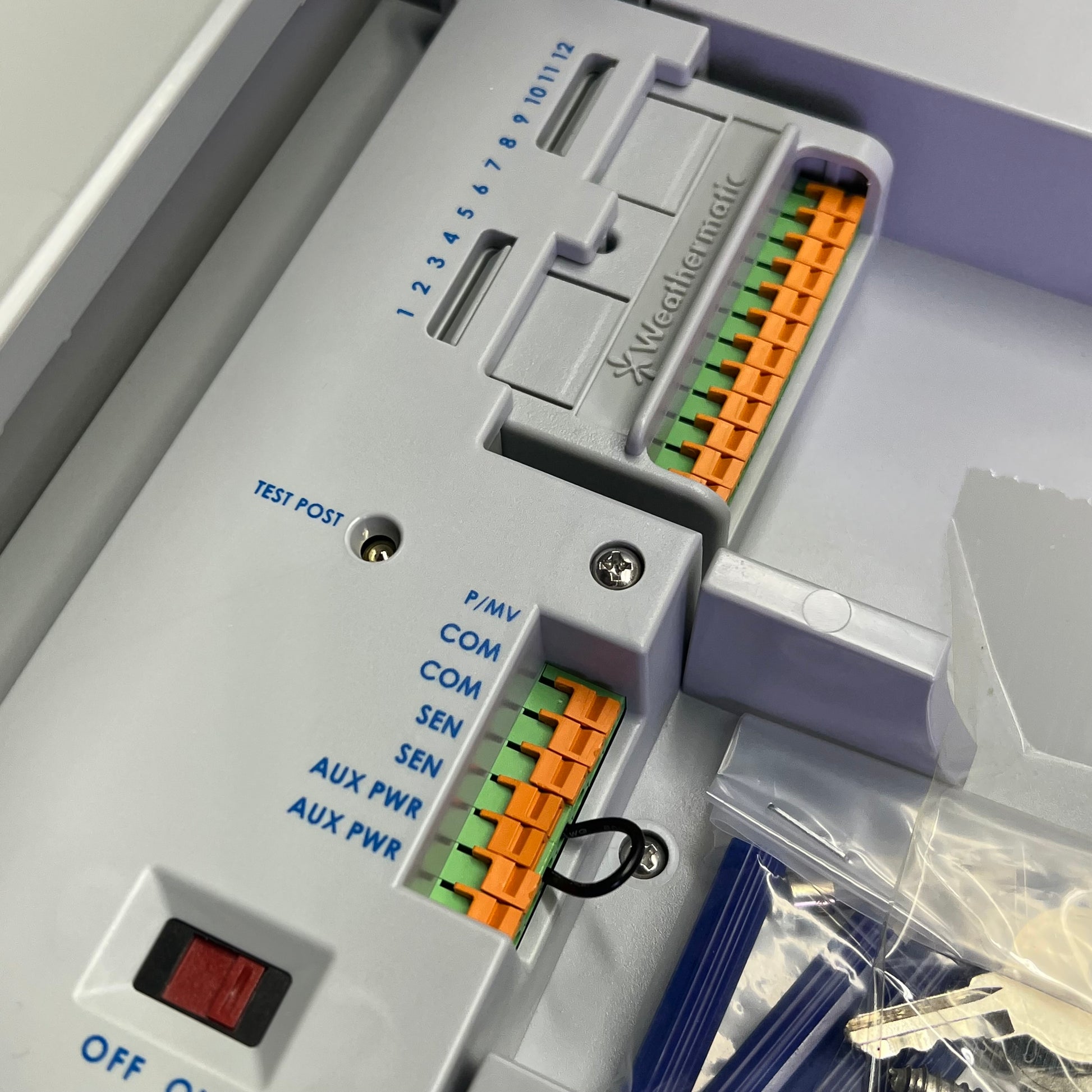 Rain/Freeze sensor bypass/active button located on face panel displays sensor status with tri-color LEDs (red indicates sensor is prohibiting irrigation; orange indicates an extended rain delay after weather station rain sensor permits irrigation; green indicates normal operation)