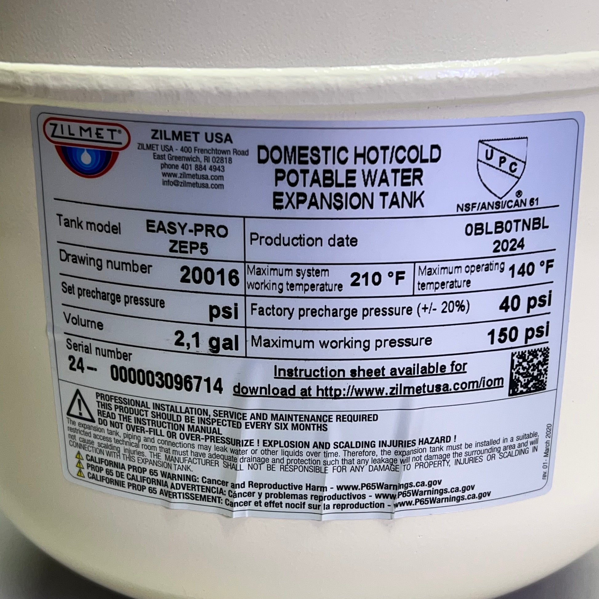 Description: In-line thermal expansion tank for hot water heaters. This unit features a polypropylene liner that eliminates internal corrosion, a 150 psi maximum pressure rating, and a 210°F operating temperature