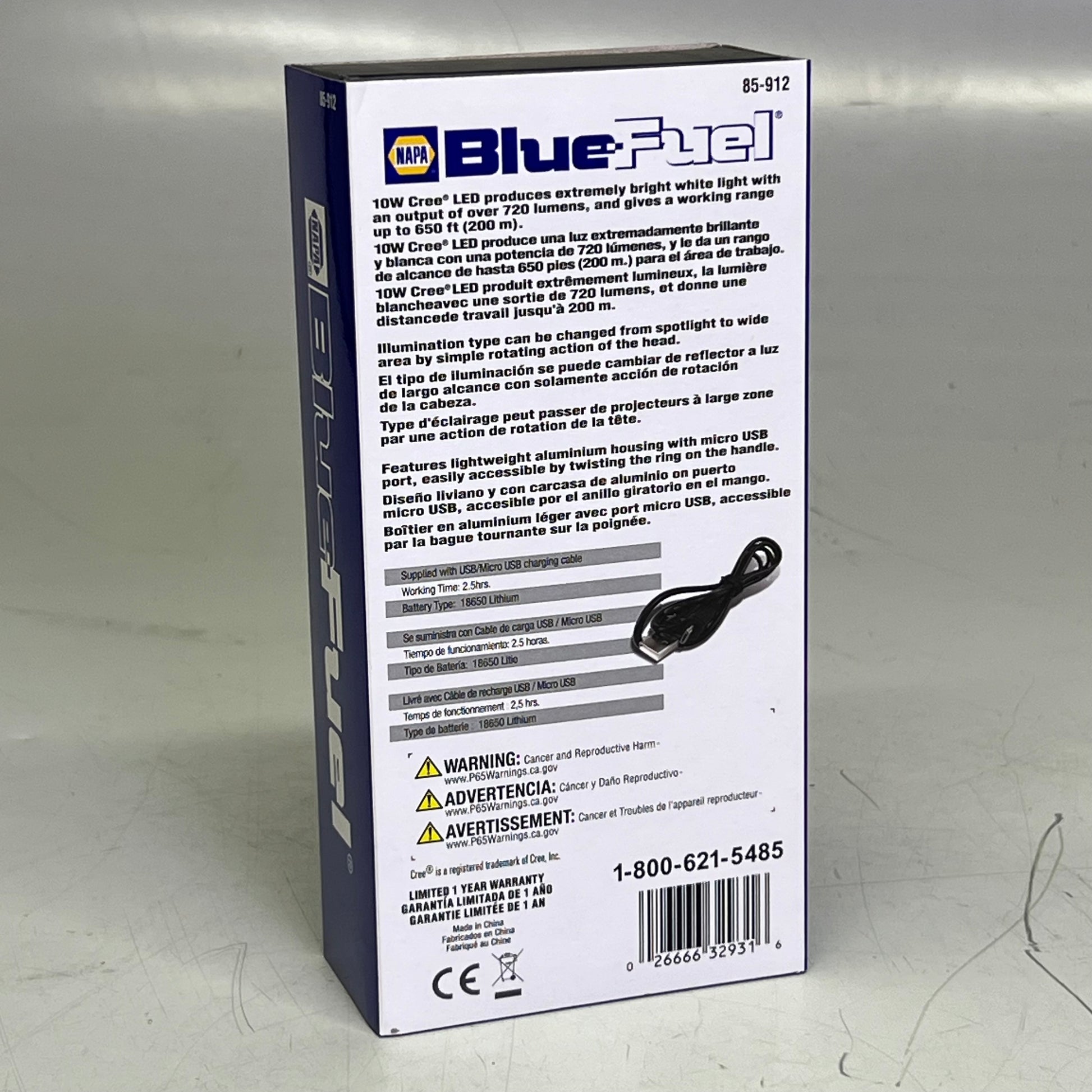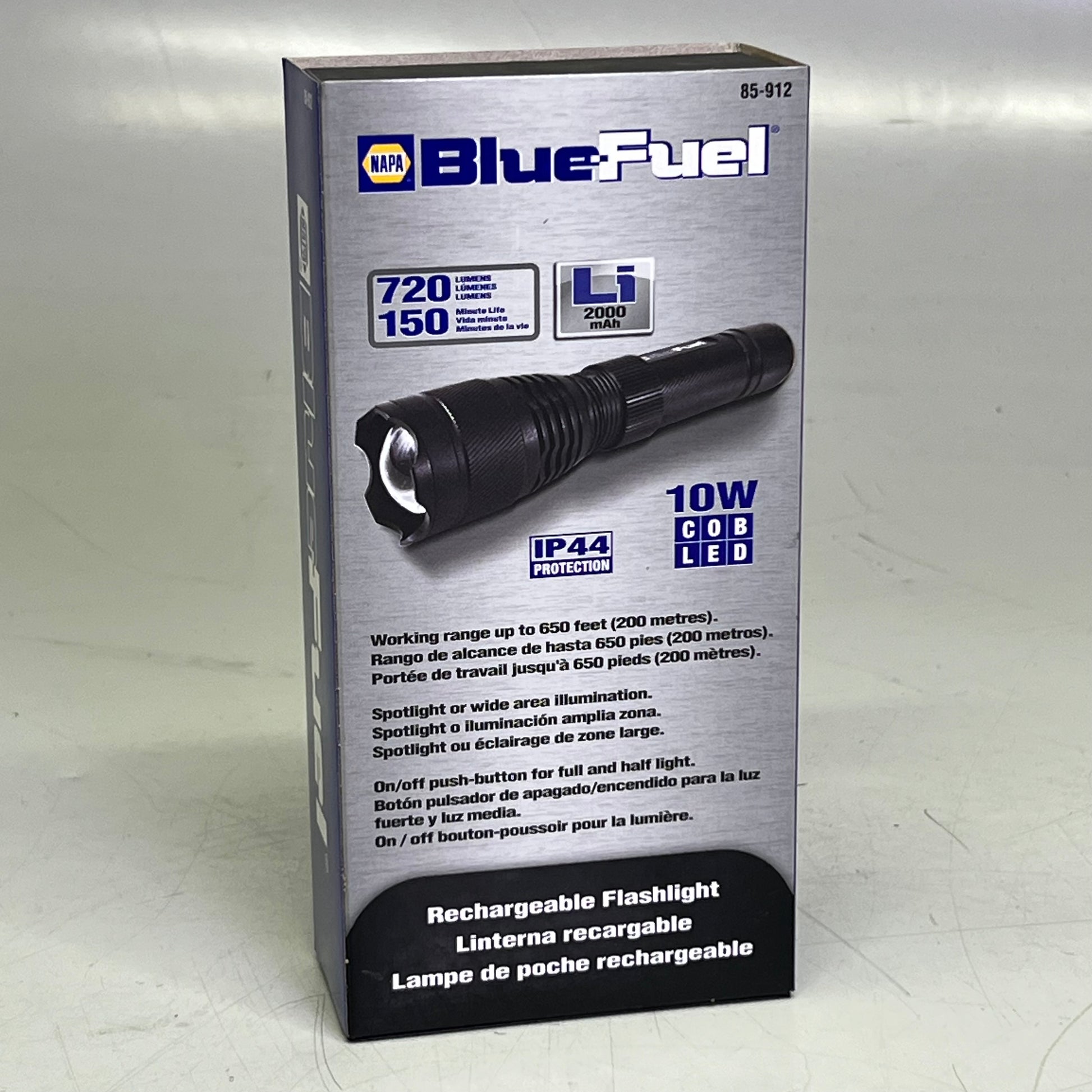 The NAPA 85-912 flashlight's 2000mAh rechargeable lithium ion battery provides plenty of the power. The lithium ion battery provides longer life, no memory effect and a much slower discharge than traditional Ni-MH batteries. The powerful 10 Watt CREE LED provides up to 500 lumens output, to illuminate the entire work area. Rotate the barrel to focus the beam.