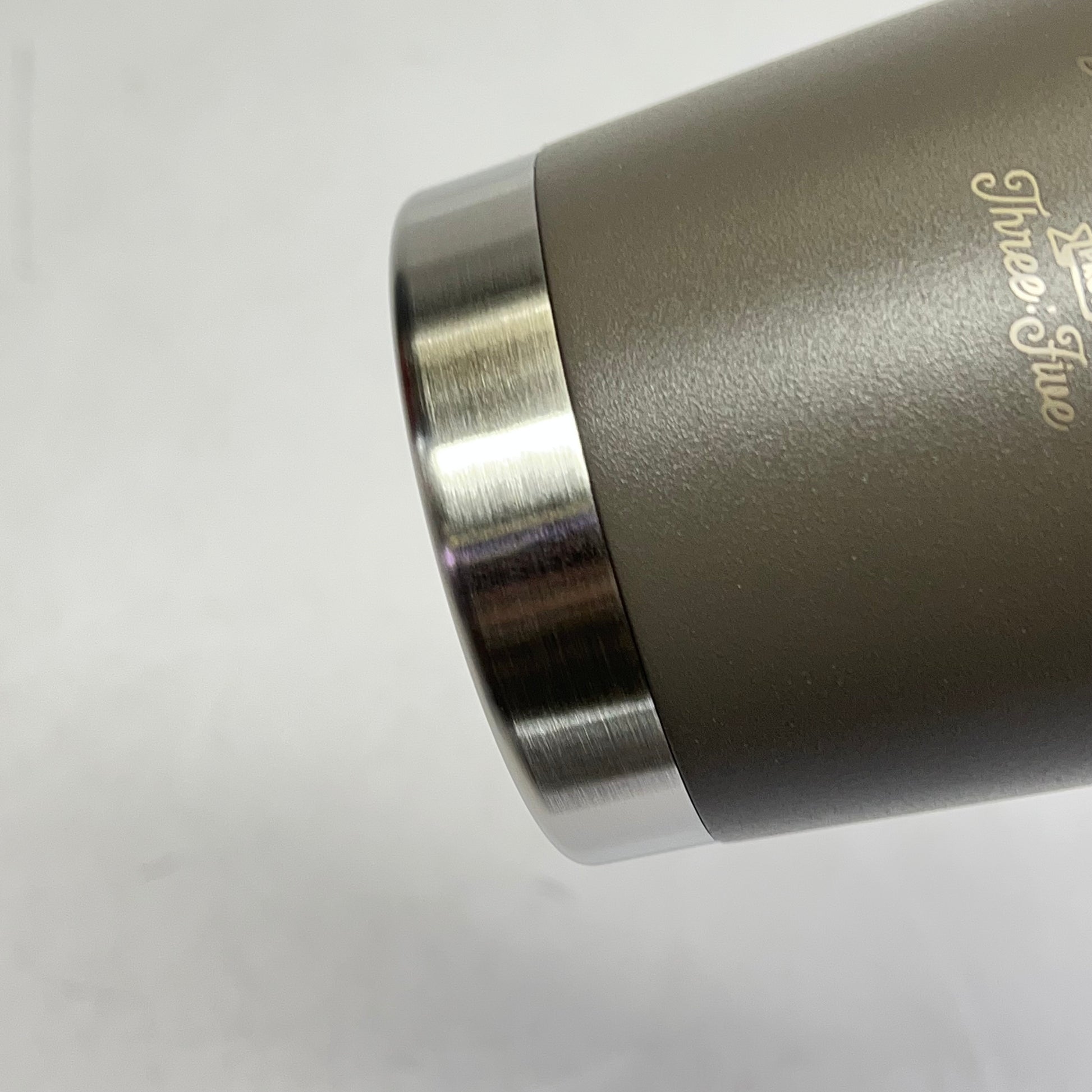Taupe background with silver stainless steel text