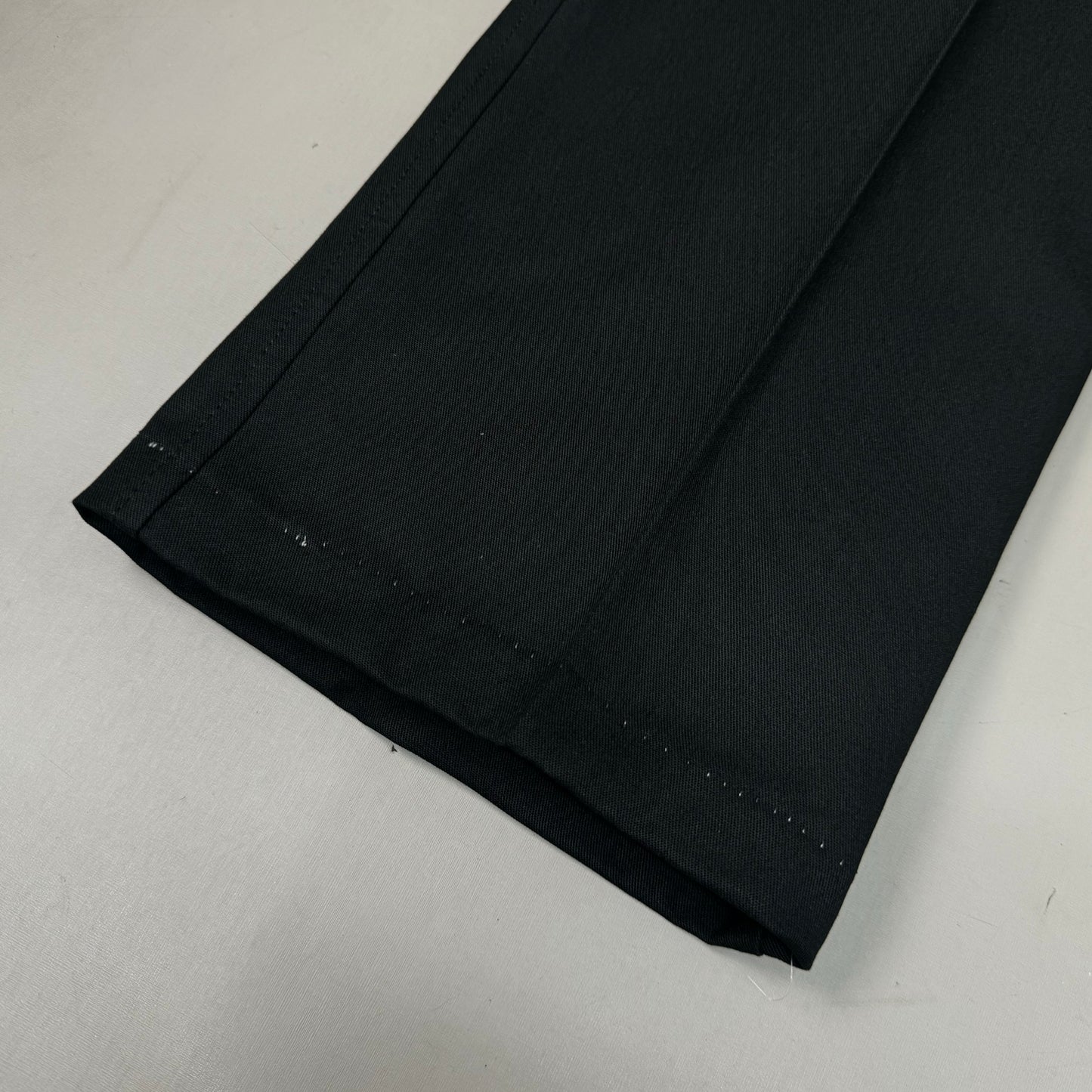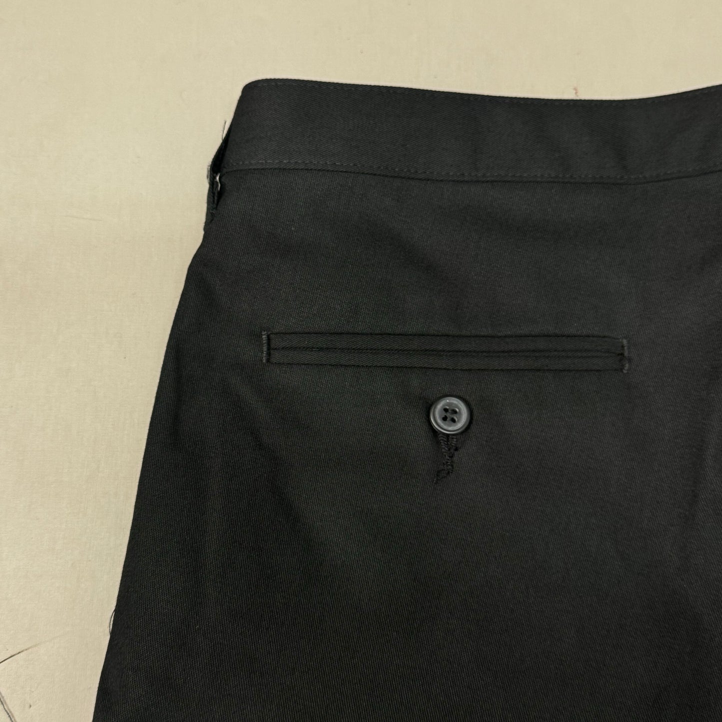 Flat front; button closure and brass zipper