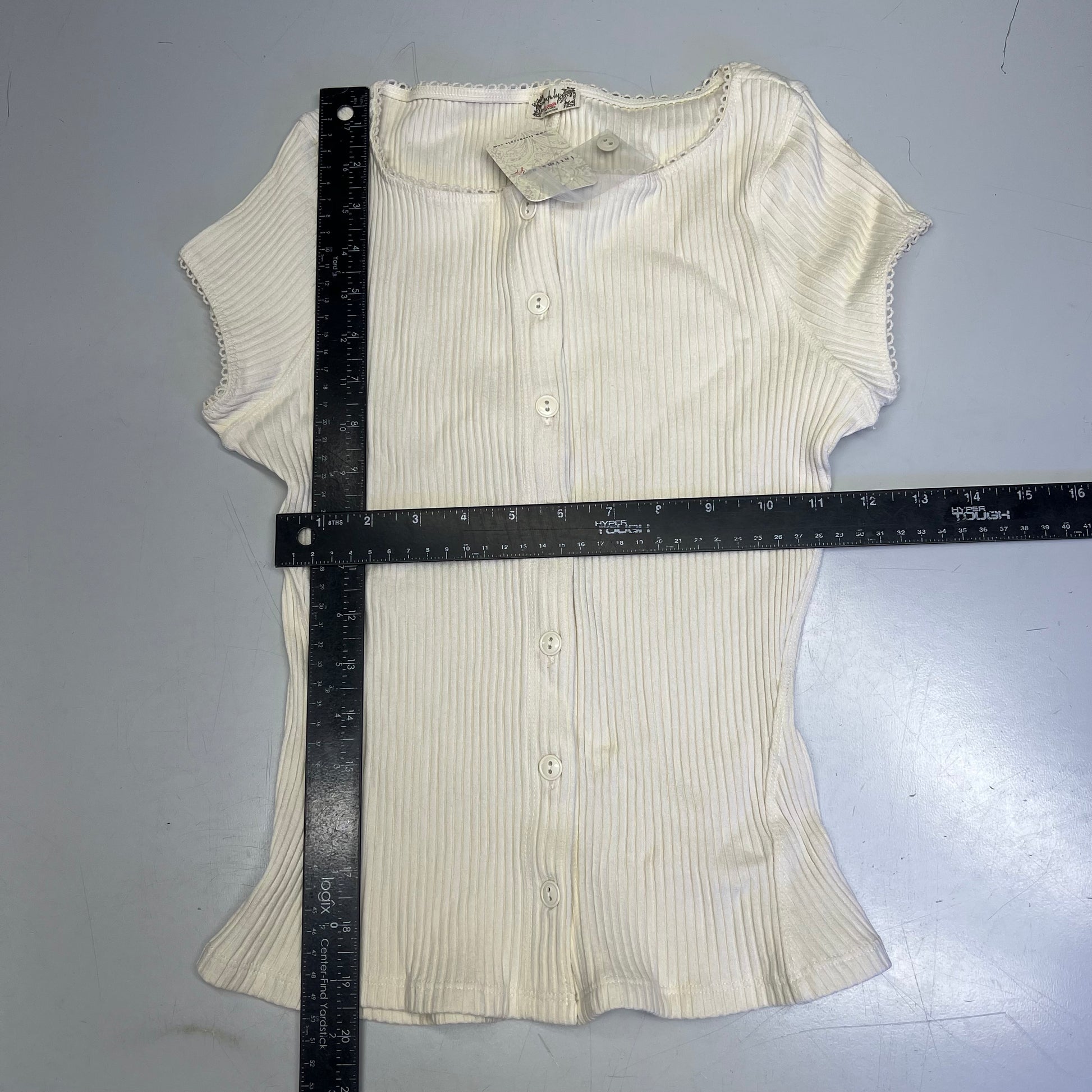 Features: Ribbed swit fabrication, crew neckline, button-front closure, capped sleeves, picot trim
