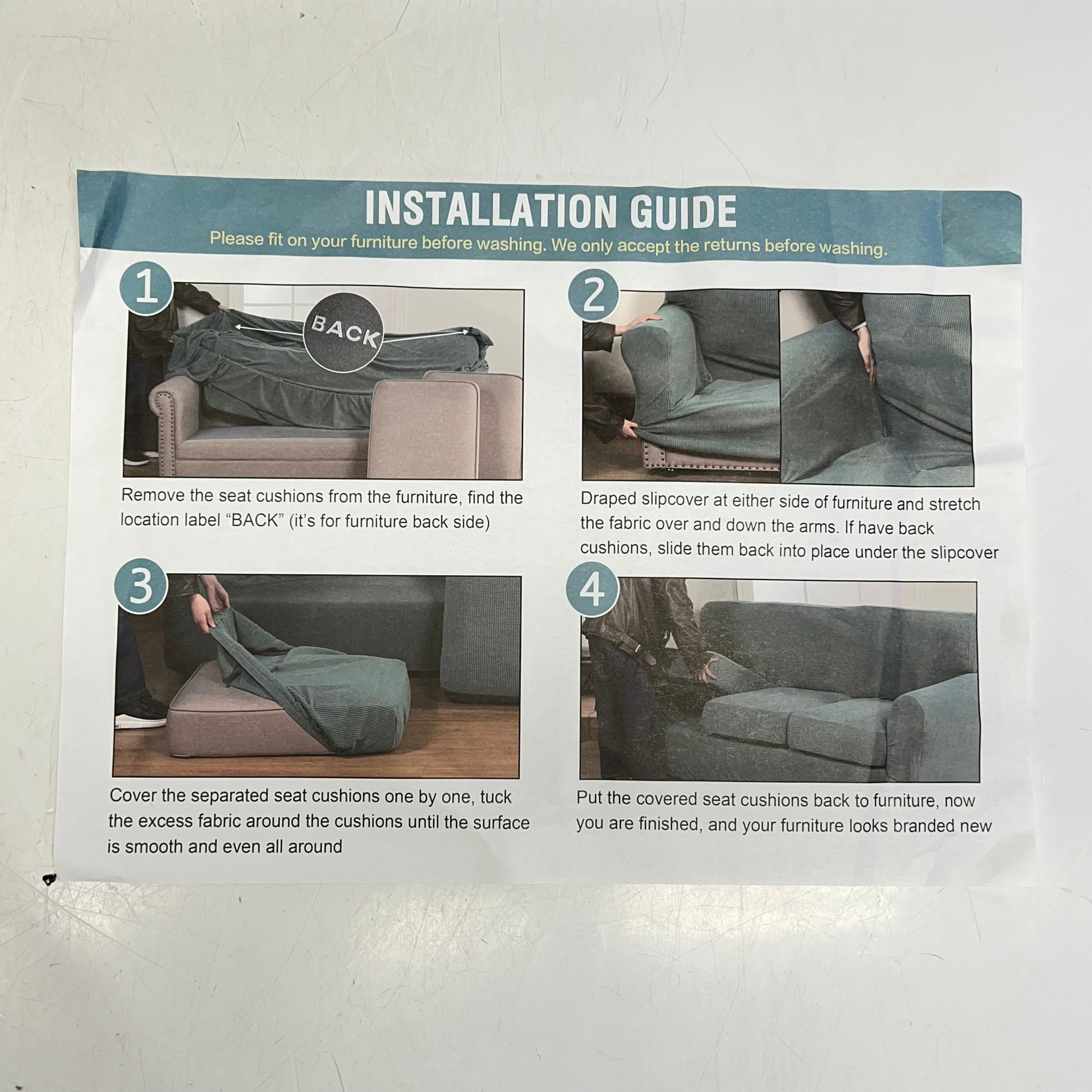 Includes: Three Seat Slips - Body of Couch w/ Arm Rest Covers