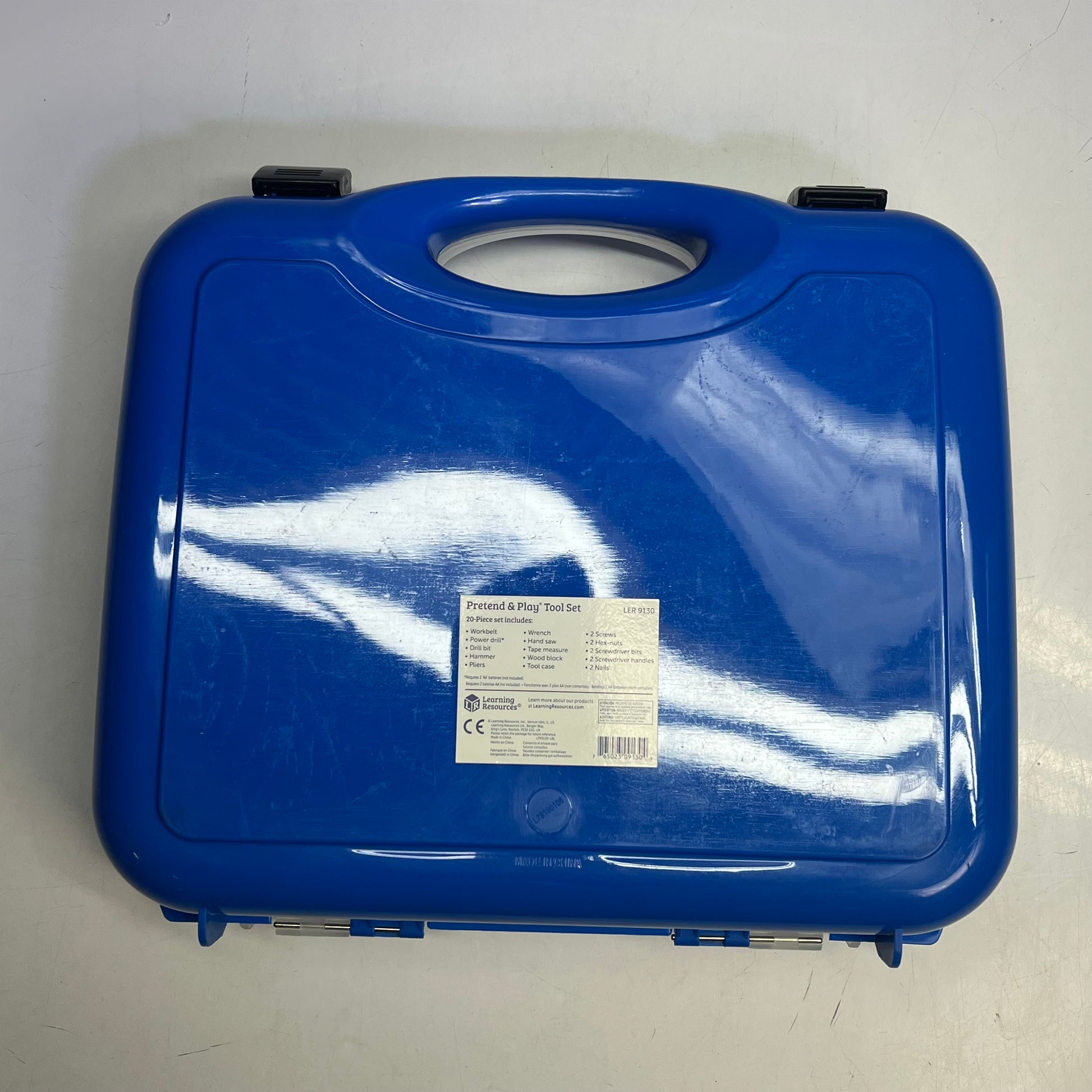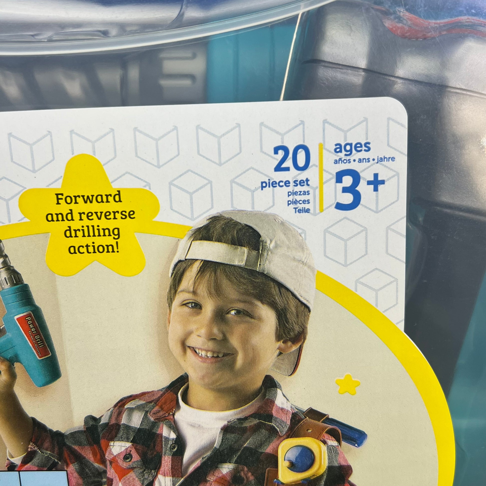 Set includes a durable plastic hammer, saw, tape measure, nuts, bolts, wood board for "drilling," battery-powered drill and handy tool belt