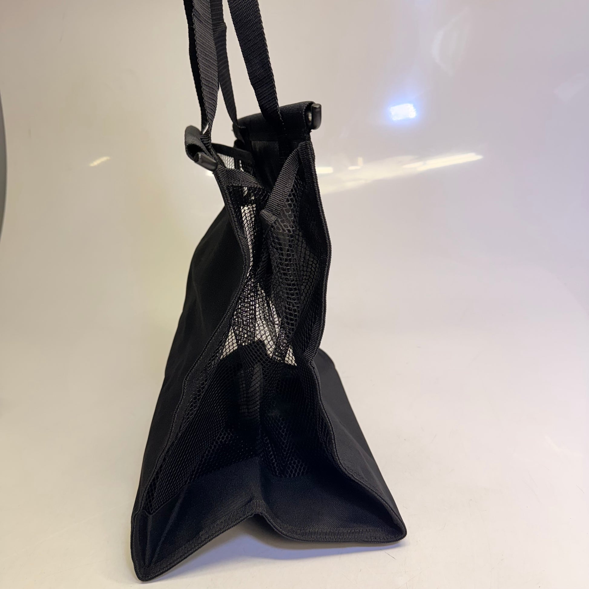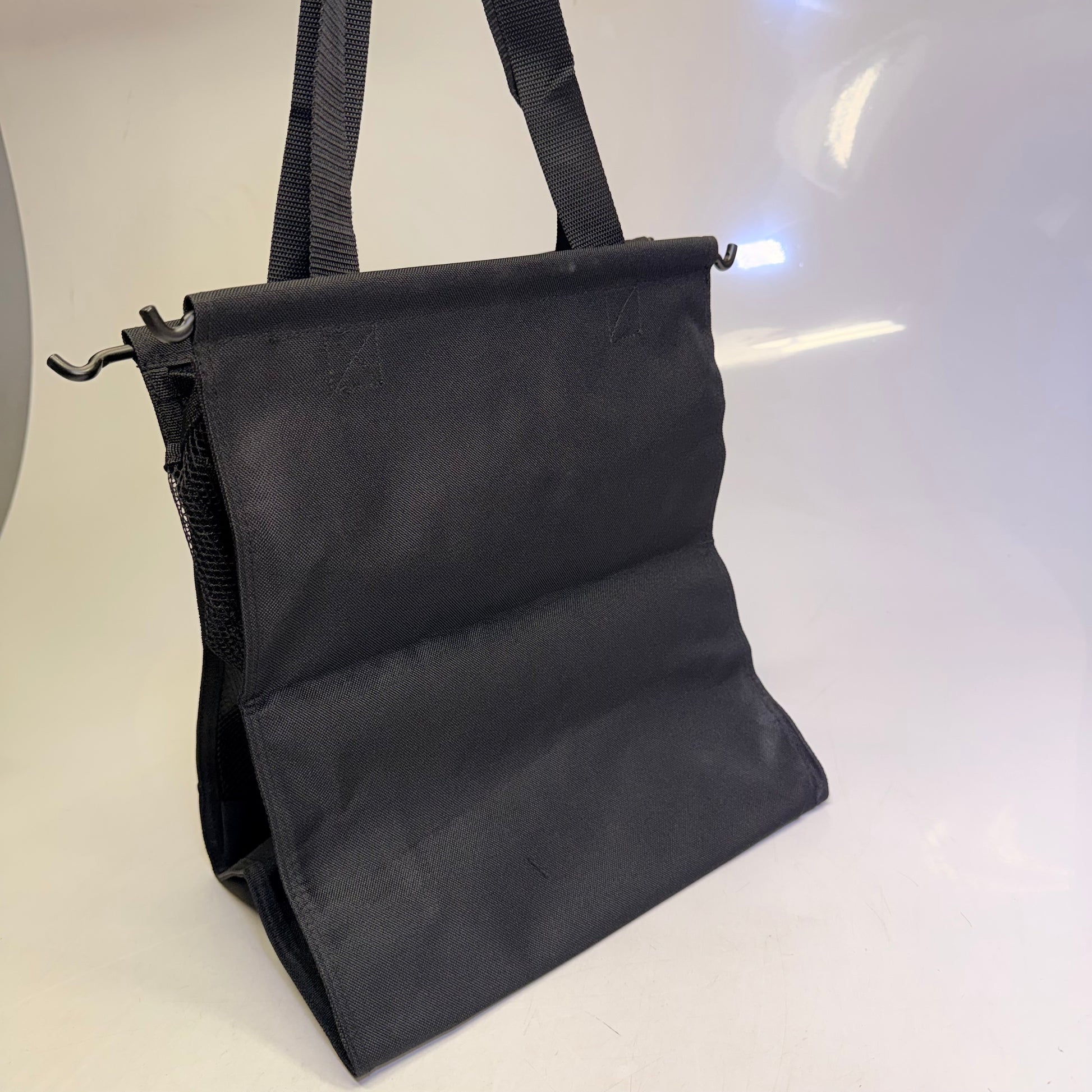 Our Hamper Bag keeps laundry out-of-sight and out-of-mind, hiding behind a closed, hinged cabinet hamper door. It is shaped like a basket, but it feels like a tote bag with its fully-lined, woven black fabric and soft mesh side panels. Garment ventilation and viewing are improved with the elegant, matte black steel frame maintaining its slanted rim shape (for clearance of the shelf above the hamper door). Best of all, it's a snap to install and use. Simply lift the bag from its frame using the fold-down handles to carry the contents off for washing. It's that simple.