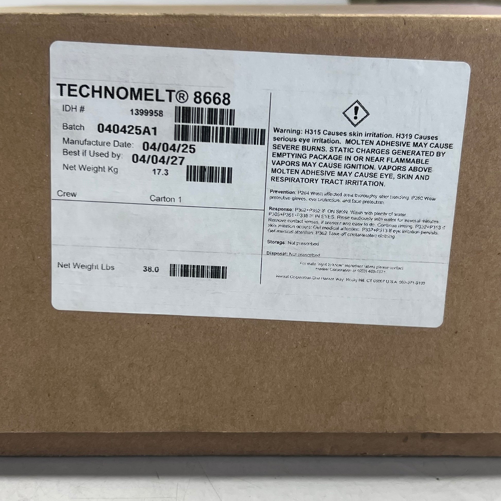 Technomelt light amber 8668 hot melt adhesive. Additonally, this hot melt adhesive has a melting point of 284 F. Comes in a Box.