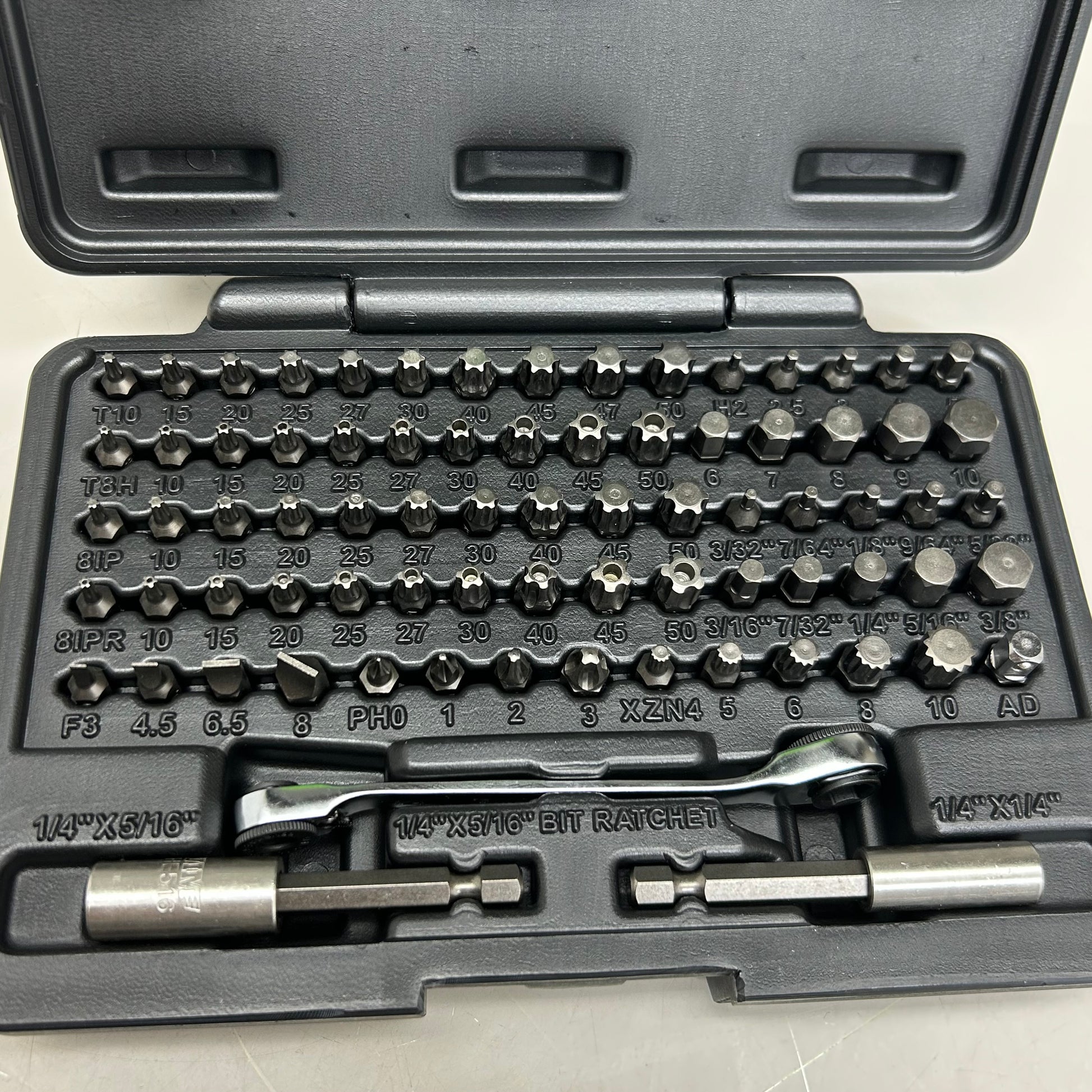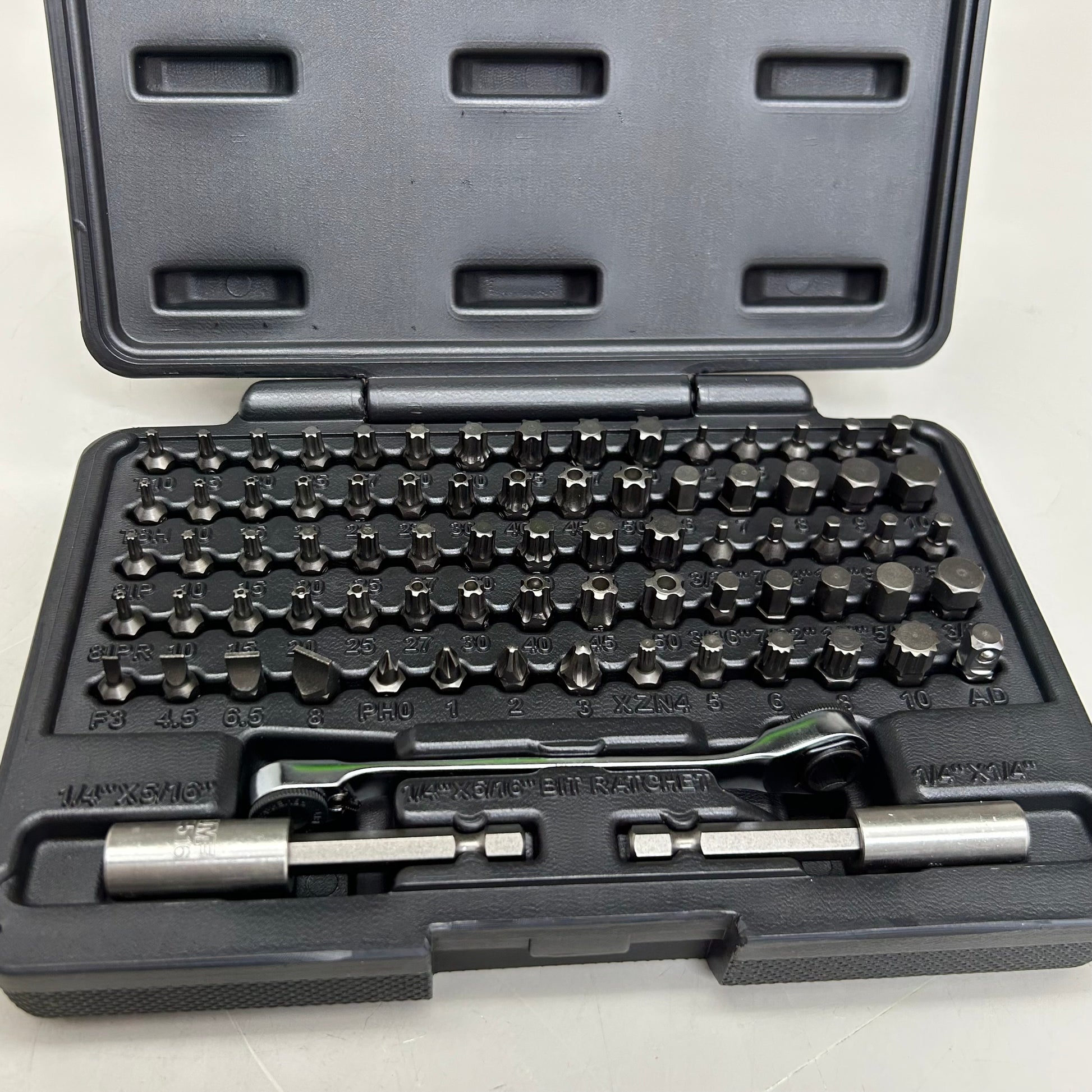 10-piece Torx: T10-T50, 10-piece tamper proof Torx: T8-T50, 10-piece Torx Plus: T8-T50, 10-piece Torx Plus 5 point: T8-T50, 10-piece hex inch: 3/32 inch - 3/8 inch, 10-piece hex metric: 2 millimeter - 10 millimeter, 4-piece Phillips: 0, 1, 2 and 3, 4-piece flat tip: 3, 4.5, 6.5, and 8, 5-piece XZN 12 point: 4, 5, 6, 8 and 10, 1-piece 5/16 inch hex drive adapter, 1 piece 1/4 inch hex extension, 1 piece 5/16 inch hex extension, and 1 piece 5/16 inch bit ratchet wrench.