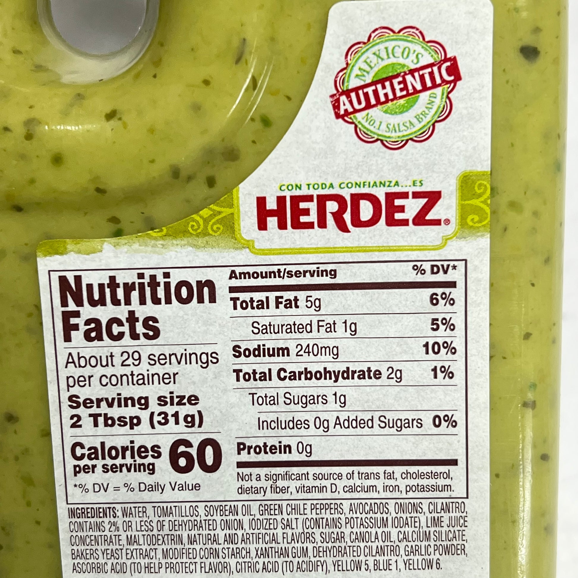 Water, Tomatillos, Soybean Oil with TBHQ (Antioxidant), Green Chile Peppers, Onions, Avocados, Cilantro, Seasoning Blend (Maltodextrin, Iodized Salt, Natural and Artificial Flavors, Citric Acid [To Acidify], Sugar, Canola Oil, Calcium Silicate, Baker’s Yeast Extract, Yellow 5, Modified Corn Starch, Blue 1, Yellow 6), Contains 2% or less of Dehydrated Onion, Iodized Salt (Contains Potassium Iodate), Lime Juice Concentrate, Xanthan Gum, Garlic Powder, Dehydrated Cilantro, Ascorbic Acid (To Help Protect Flavor), Citric Acid (To Acidify), Natural Flavor, Sodium Alginate.