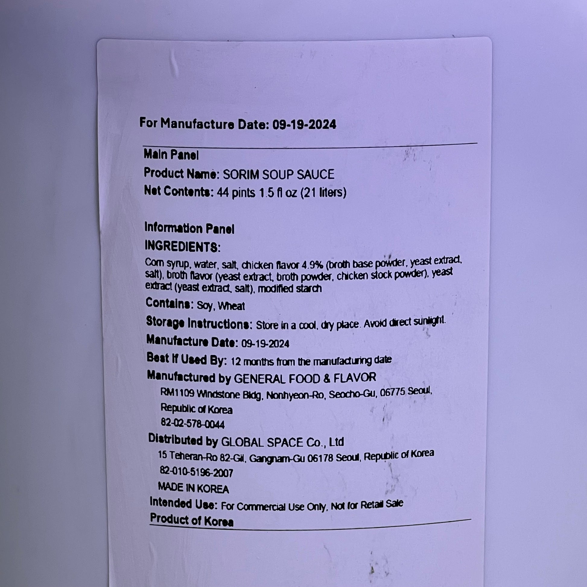 GLOBAL SPACE Sorim Soup Sauce 21 Lt, White Container BB: 09/25