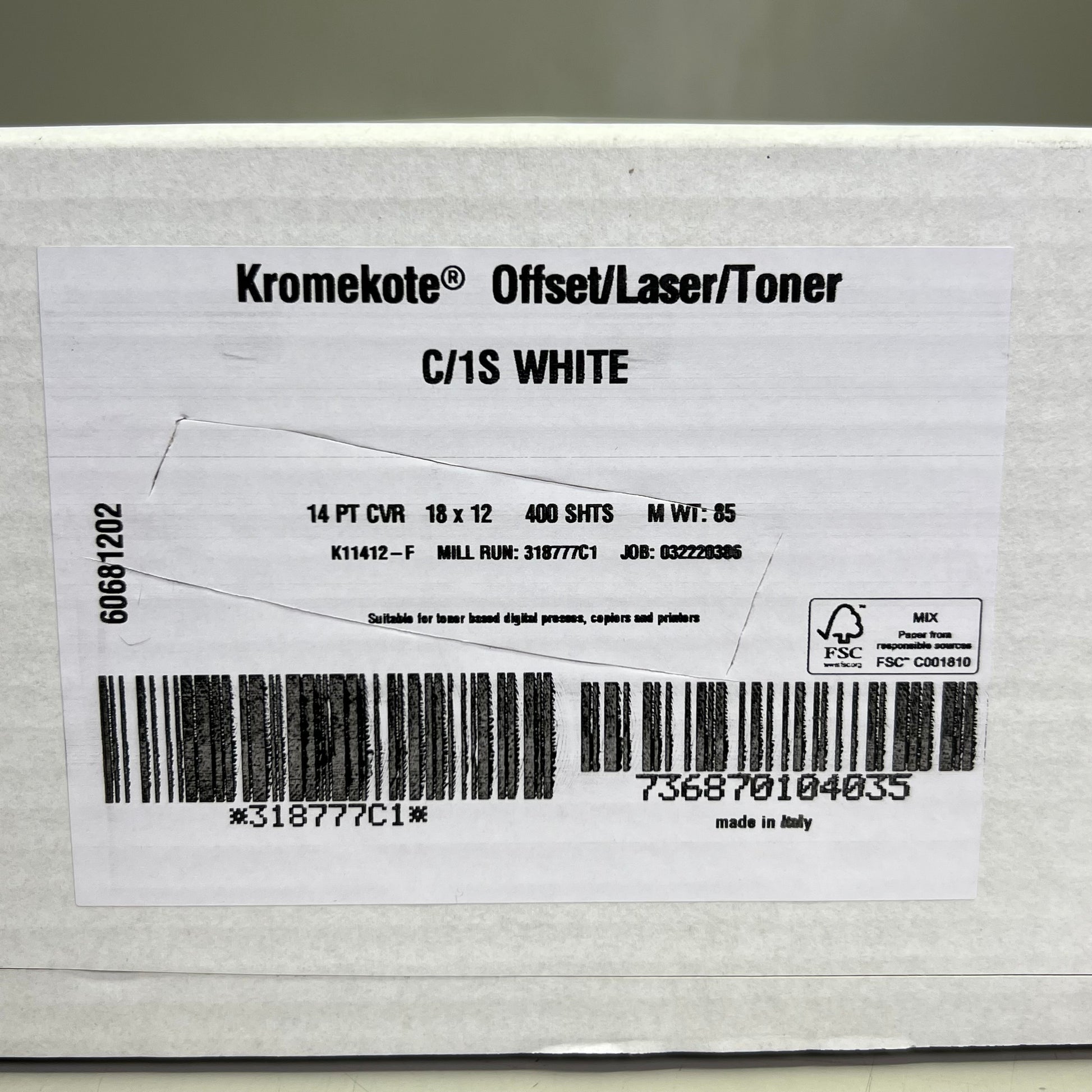 The KROMEKOTE Offset/Laser/Toner Paper is a high-quality, versatile paper designed for use in offset printing, laser printers, and toner-based systems. Featuring an 18" x 12" size and bright white finish, this paper delivers crisp, vibrant print quality for a wide range of printing applications, from business cards to brochures, flyers, and promotional materials. With its smooth texture and superior coating, KROMEKOTE paper ensures professional-level results every time. Ideal for high-volume printing, each pack contains 400 sheets, providing the ideal solution for businesses, print shops, and office environments that demand reliable performance and consistency.